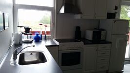 4-Platten Herd, Kühlschrank mit Gefrierfach, Korkenzieher / Flaschenöffner, Mülltüten, Essplatz in der Küche