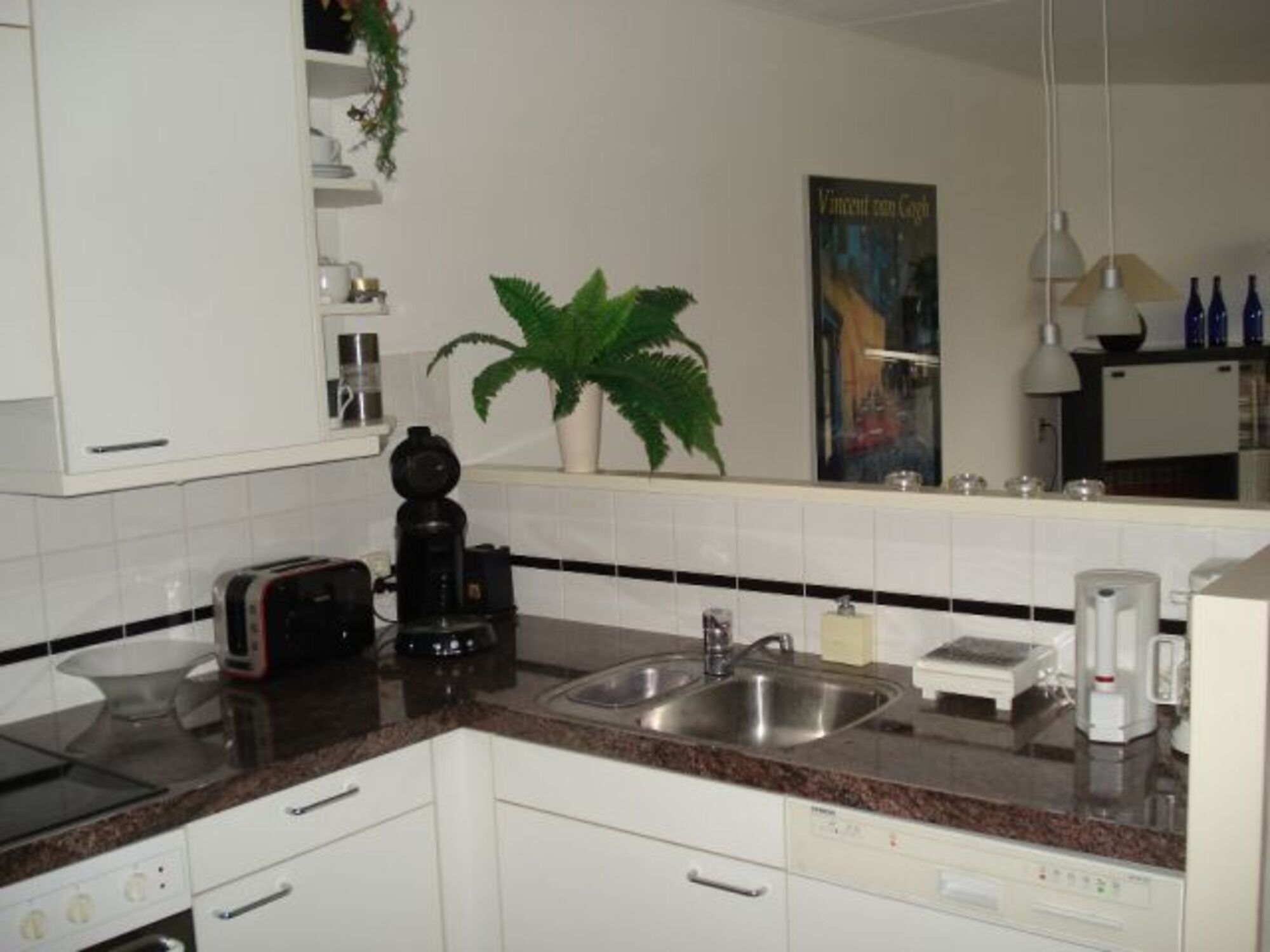 4-Platten Herd, Kühlschrank mit Gefrierfach, Nespresso-Automat, Korkenzieher / Flaschenöffner, Öl / Essig, Geschirrhandtücher