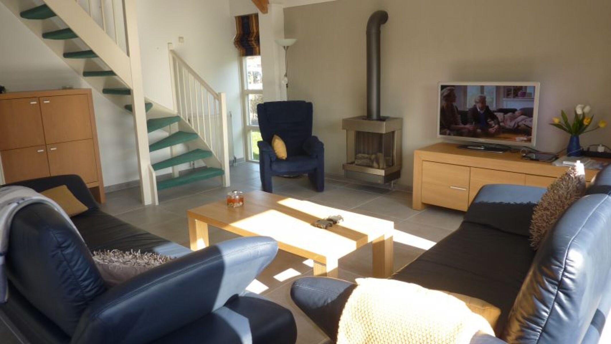 TV, HDTV Flachbildschirm, DVD-Player, Bücher, Offener Kamin, Kaminofen, 3er-Sofa, 2er-Sofa, Sessel