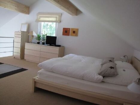 Das größere Schlafzimmer befindet sich auf der offenen Empore über dem Wohnraum. Dort ist auch genügend Platz, um das Babybett aufzustellen. Doppelbett 1,80 x 2,00m, Kommode