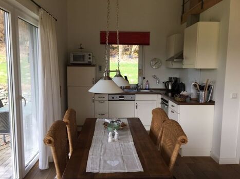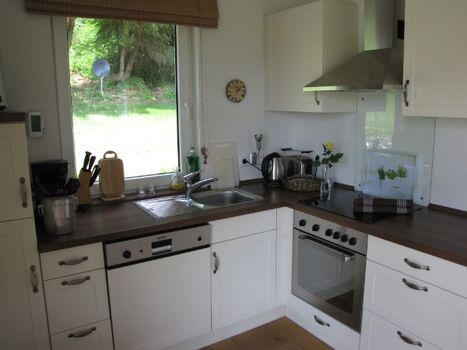 Ausgestattet ist dieses komfortabel eingerichtete und voll ausgestattete Ferienhaus mit 2 Schlafzimmern (davon eines auf der offenen Empore über dem Wohnraum) und einer modernen Küchenzeile (mit Ceranfeld, Backofen, Kühlschrank mit Gefrierfach, Spülmaschine, Kaffeevollautomat inklusive Kaffeebohnen, Kaffeemaschine, Wasserkocher, Toaster, Mikrowelle, Waffeleisen, Mixer).