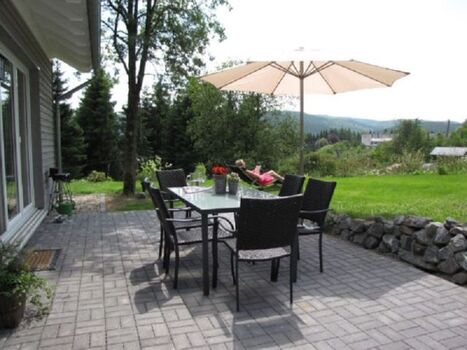 Außerdem gibt es einen gemütlichen Wohnraum mit Kaminofen, Ledersofas, Essplatz, 3 Fernsehern (im Wohnraum und in beiden Schlafzimmern), Duschbad, WC, Hauswirtschaftsraum mit Waschmaschine und Trockner, kostenlosem WLAN und Sauna, sowie eine schön möblierte Sonnen-Terrasse mit Weitblick.