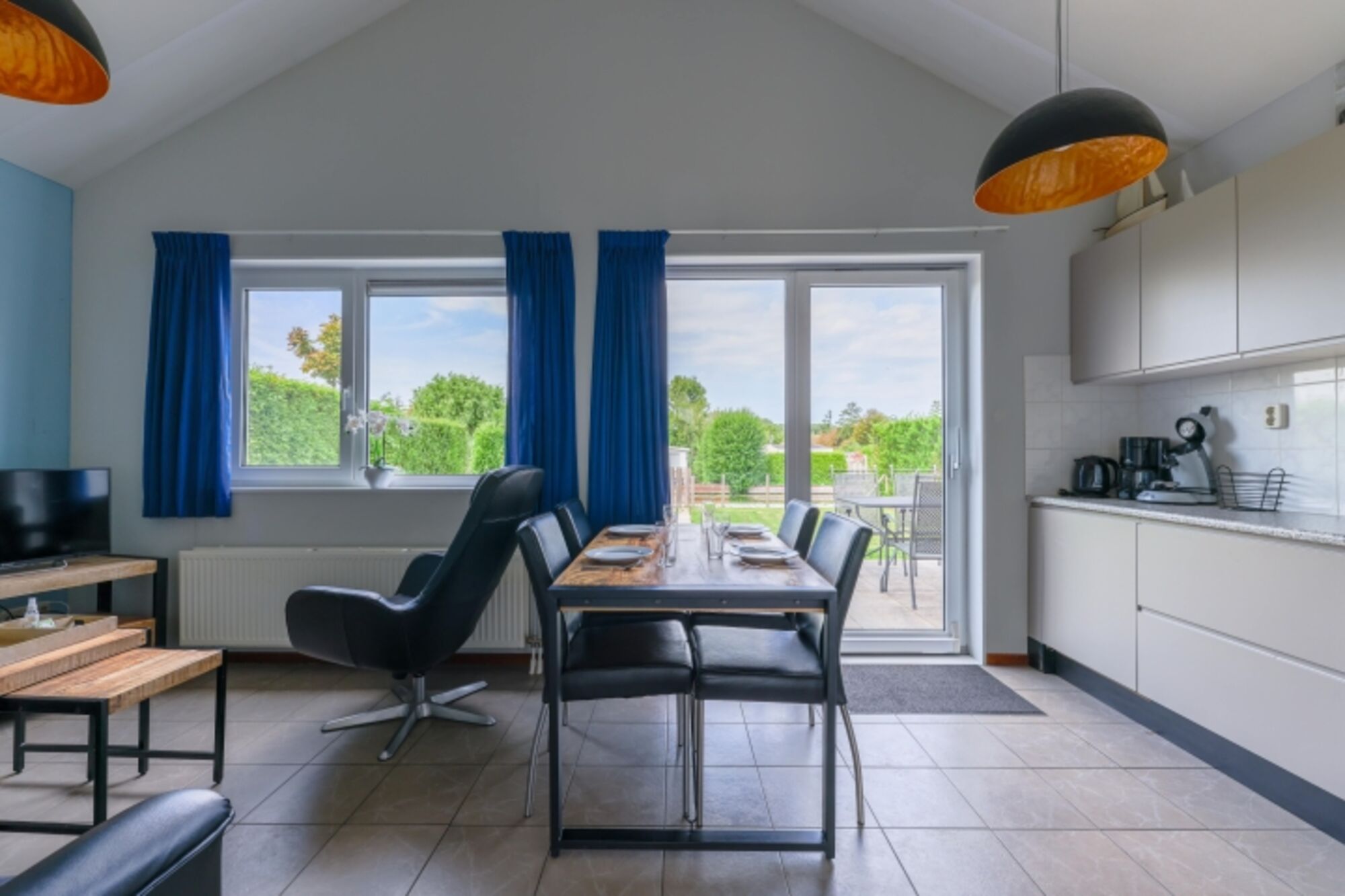 Im Erdgeschoss befindet sich ein gemütliches Wohnzimmer mit Kabel-TV sowie eine vollständig ausgestattete offene Küche mit unter anderem einem Kühlschrank mit Gefrierfach, einer Kombimikrowelle und einer Spülmaschine. Der Bungalow verfügt über 2 Schlafzimmer: eines mit 2 Einzelbetten, die aneinander stehen, und eines mit einem Einzelbett. Das Badezimmer ist mit Dusche und Toilette ausgestattet. Außerdem gibt es einen Abstellraum mit Waschmaschine.