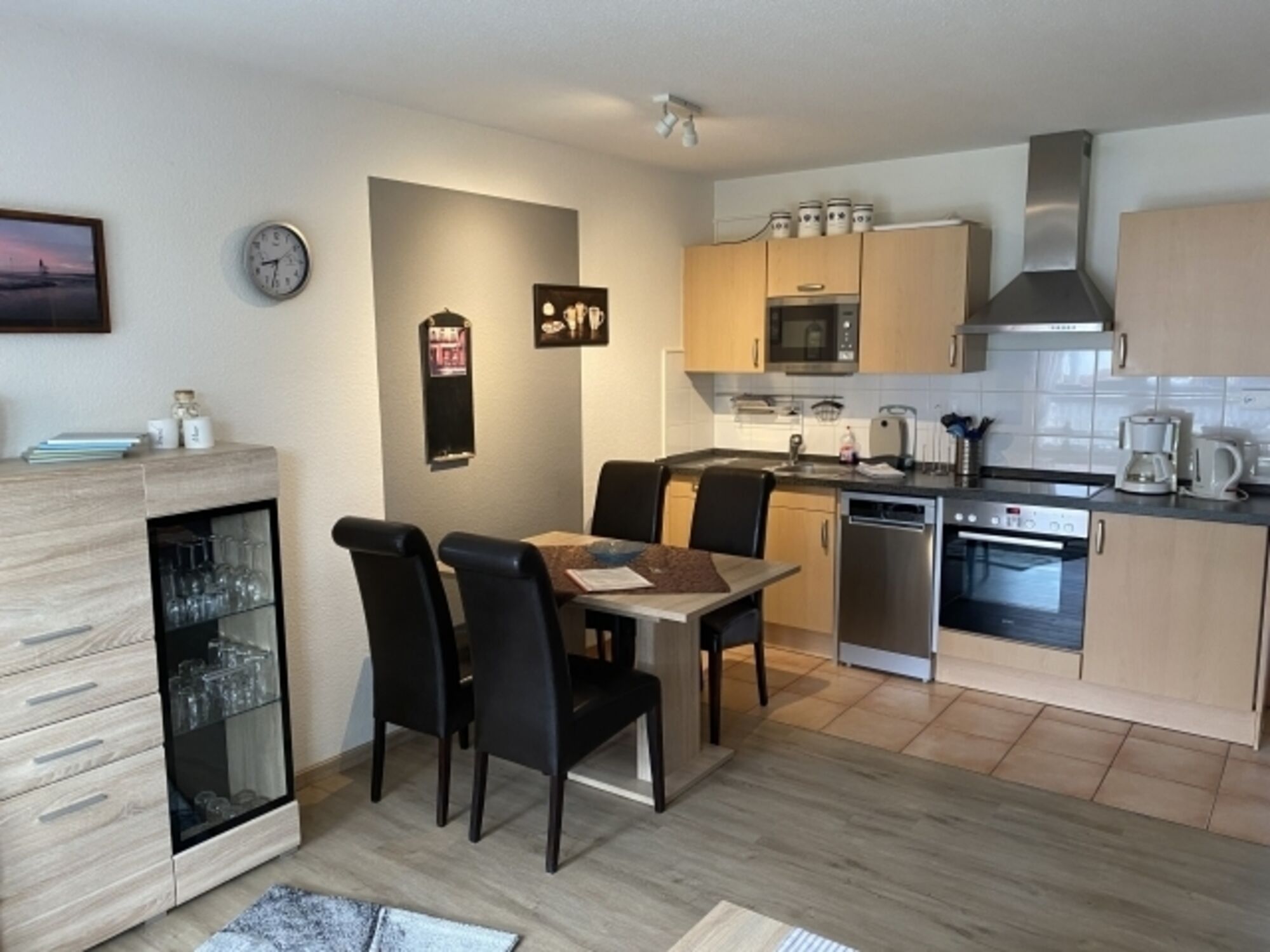 Cerankochfeld, Dunstabzugshaube, Kühlschrank mit Gefrierfach, Eierkocher, Mixer, Korkenzieher / Flaschenöffner, Essplatz in der Küche