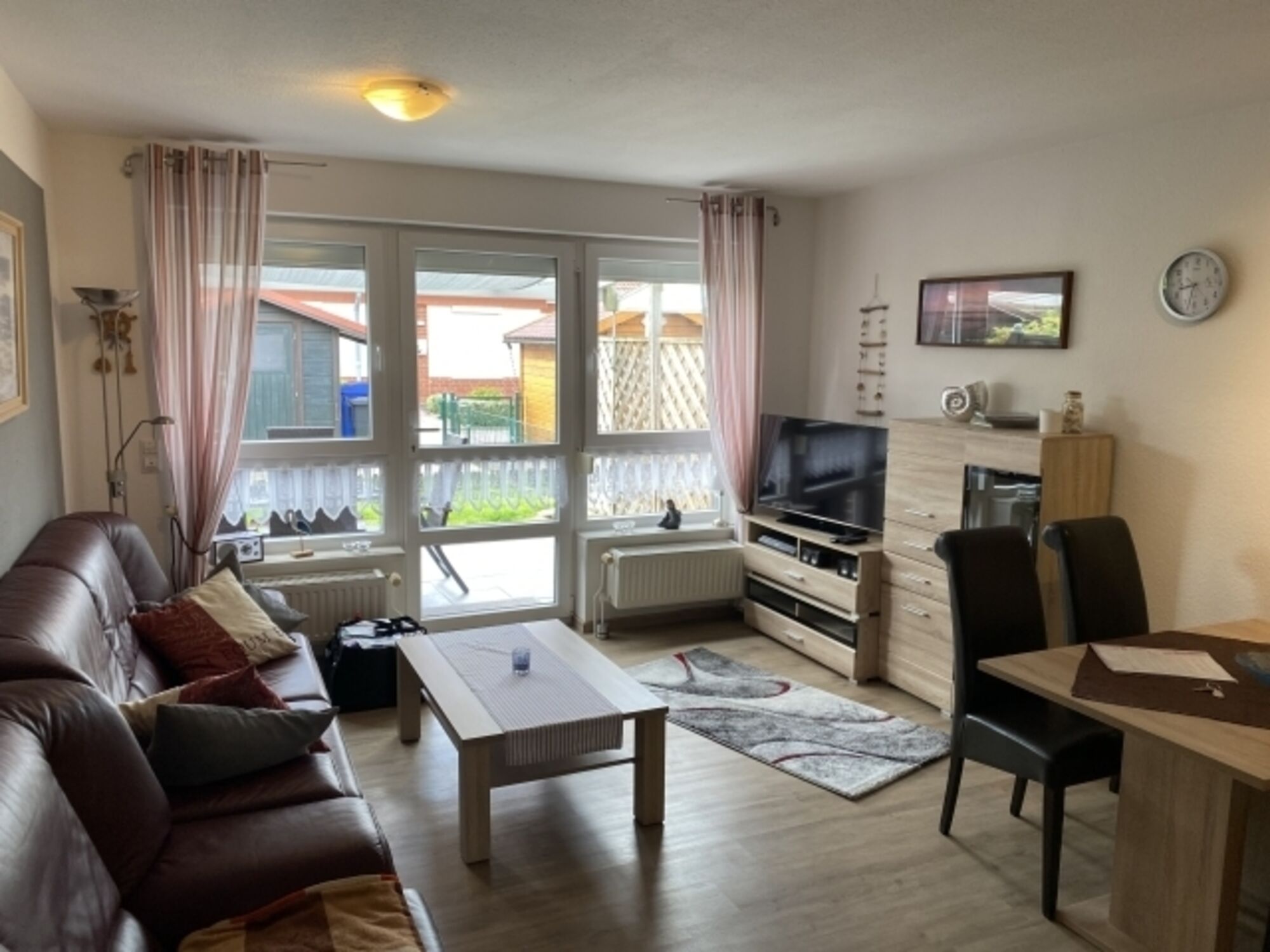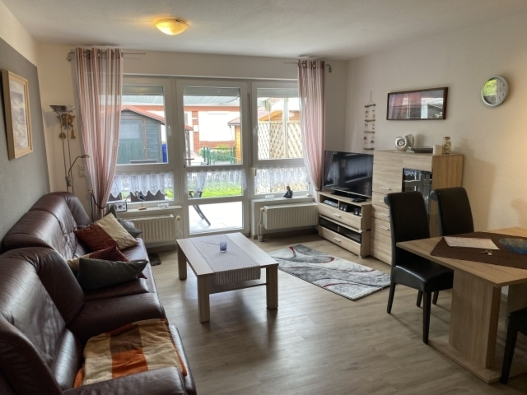 Im Erdgeschoss unseres Reihen-Ferienhauses befindet sich das Wohnzimmer mit gemütlicher Ledercouch, Sat-TV (Flatscreen), Heimkinosystem (Blu-ray-Player, DVD, CD, Radio), Essplatz und die integrierte, voll ausgestattete Küche. Zudem befindet sich unten ein Bad mit Dusche/WC und ein Schlafzimmer mit 2 Einzelbetten (Reisebett/ Hochstuhl auf Anfrage).