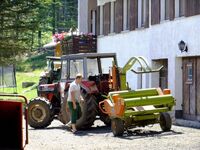 bei der Heuernte mit dem Traktor mitfahren,