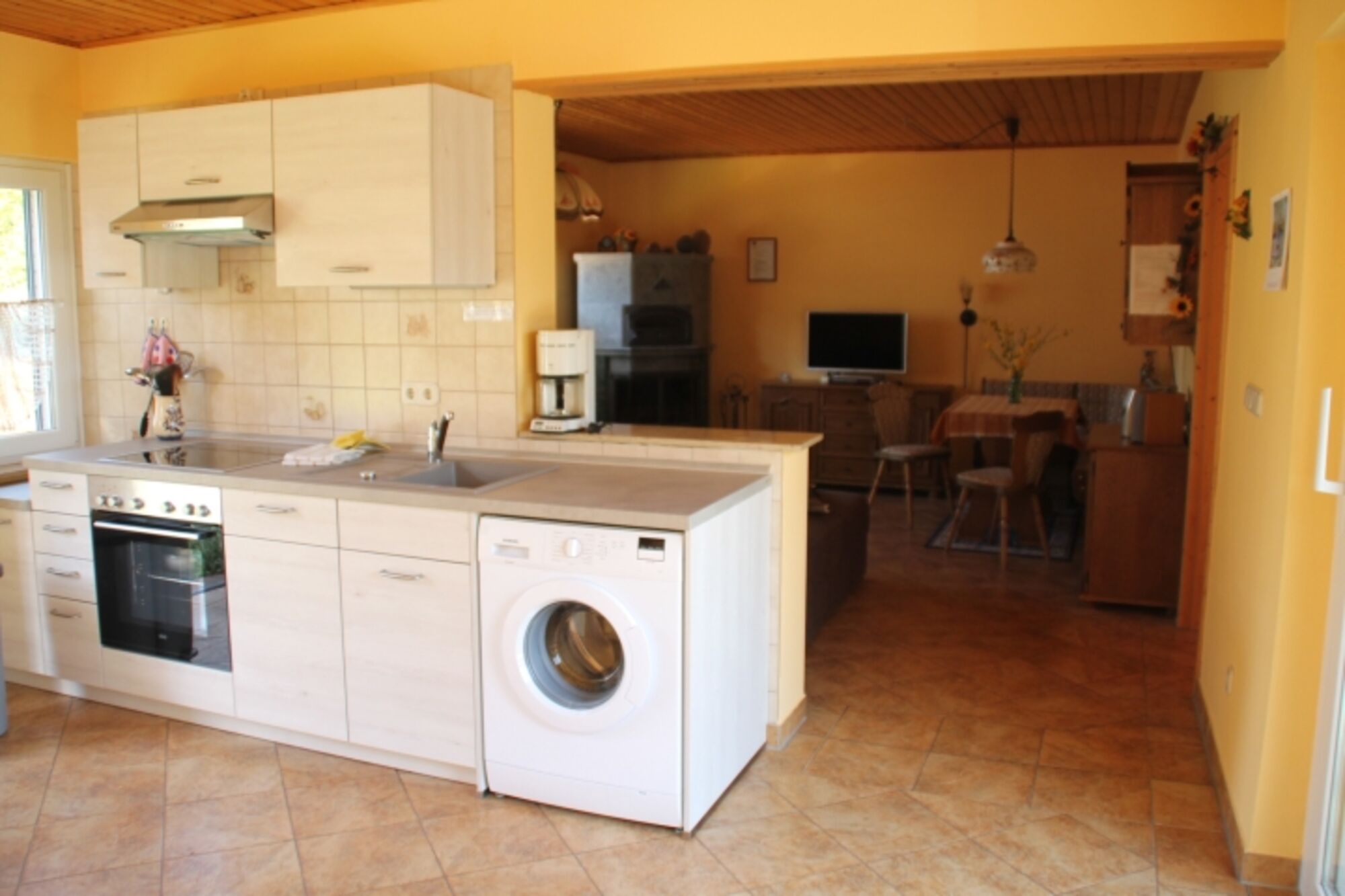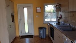 Die Küche, ausgestattet mit, Kühlschrank incl. Tiefkühlschrank, Backofen, 4-flammigem Herd, Mikrowelle, Toaster, Eier- und Wasserkocher und Kaffee- und Tassimo-Maschine, lässt kaum Wünsche offen. Selbstverständlich ist auch Geschirr und Besteck ausreichend vorhanden. Seit der Modernisierung im Jahr 2022 gehört auch eine Waschmaschine zur Ausstattung .