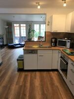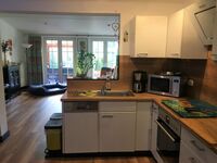 Cerankochfeld, Dunstabzugshaube, Kühlschrank mit Gefrierfach, Gefrierschrank, Eierkocher, Mixer, Korkenzieher / Flaschenöffner, Gewürze (Salz, Pfeffer, Zucker), Öl / Essig, Geschirrhandtücher, Mülltüten, Essplatz in der Küche