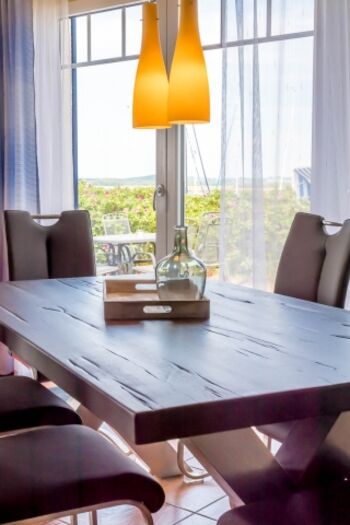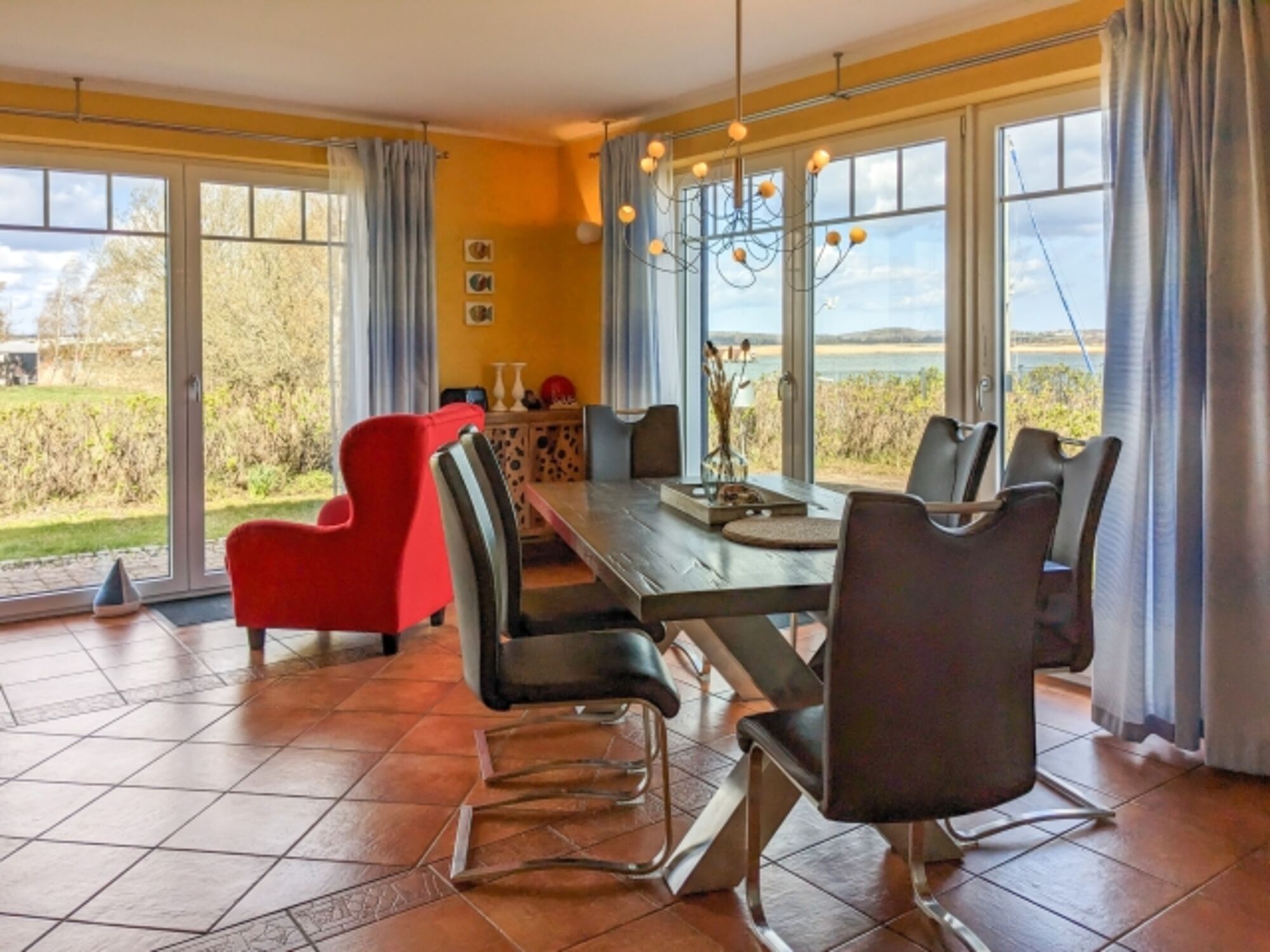 Der offene Wohn-/ Ess-/ Küchenbereich mit Kaminofen bietet einen direkten Blick auf das Wasser.