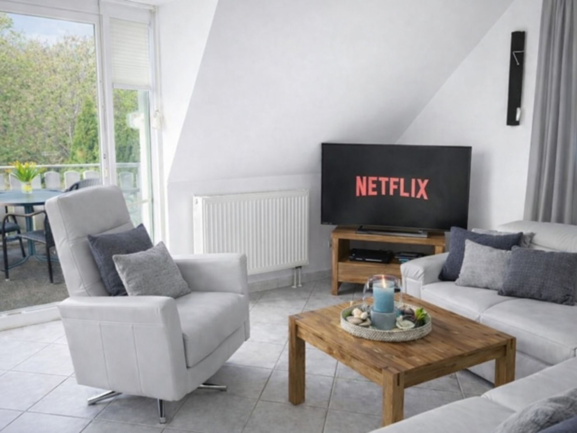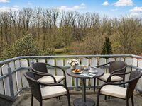 Es erwartet Sie ein Wohnzimmer mit Balkon mit unverbautem Blick in den Garten, der zur Ferienwohnung gehört, ein anliegendes Schlafzimmer mit Doppelbett, ein Dreibettzimmer mit Einzelbetten und TV, eine Küche mit Sitzecke für 5 Personen und ein Badezimmer mit Waschmaschine.