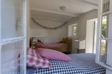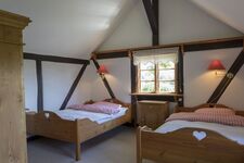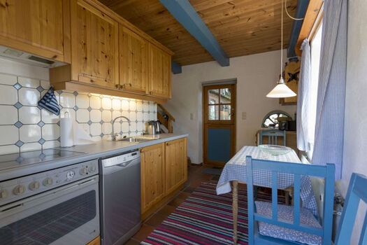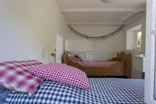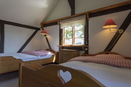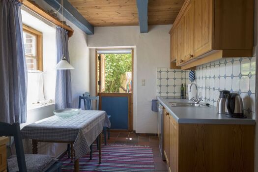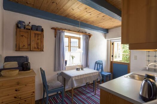 Das Gästehaus bietet Platz für 2-4 Personen. (Im Einzelfall können hier auch bis zu 8 Personen einen Schlafplatz finden, da das Haus über mehrere Betten verfügt). Im EG finden Sie eine Küche mit Esstisch, sowie ein Badezimmer mit Vollbad. Im 2. OG gibt es einen großen Wohn- und Schlafraum mit zwei Doppelbetten. Außerdem steht Ihnen bei Bedarf noch ein kleines separates Zimmer mit zwei Einzelbetten, welches über die Terrasse zugänglich ist, zur Verfügung.