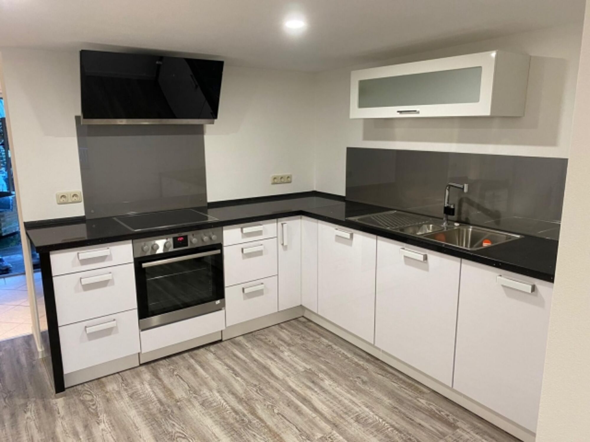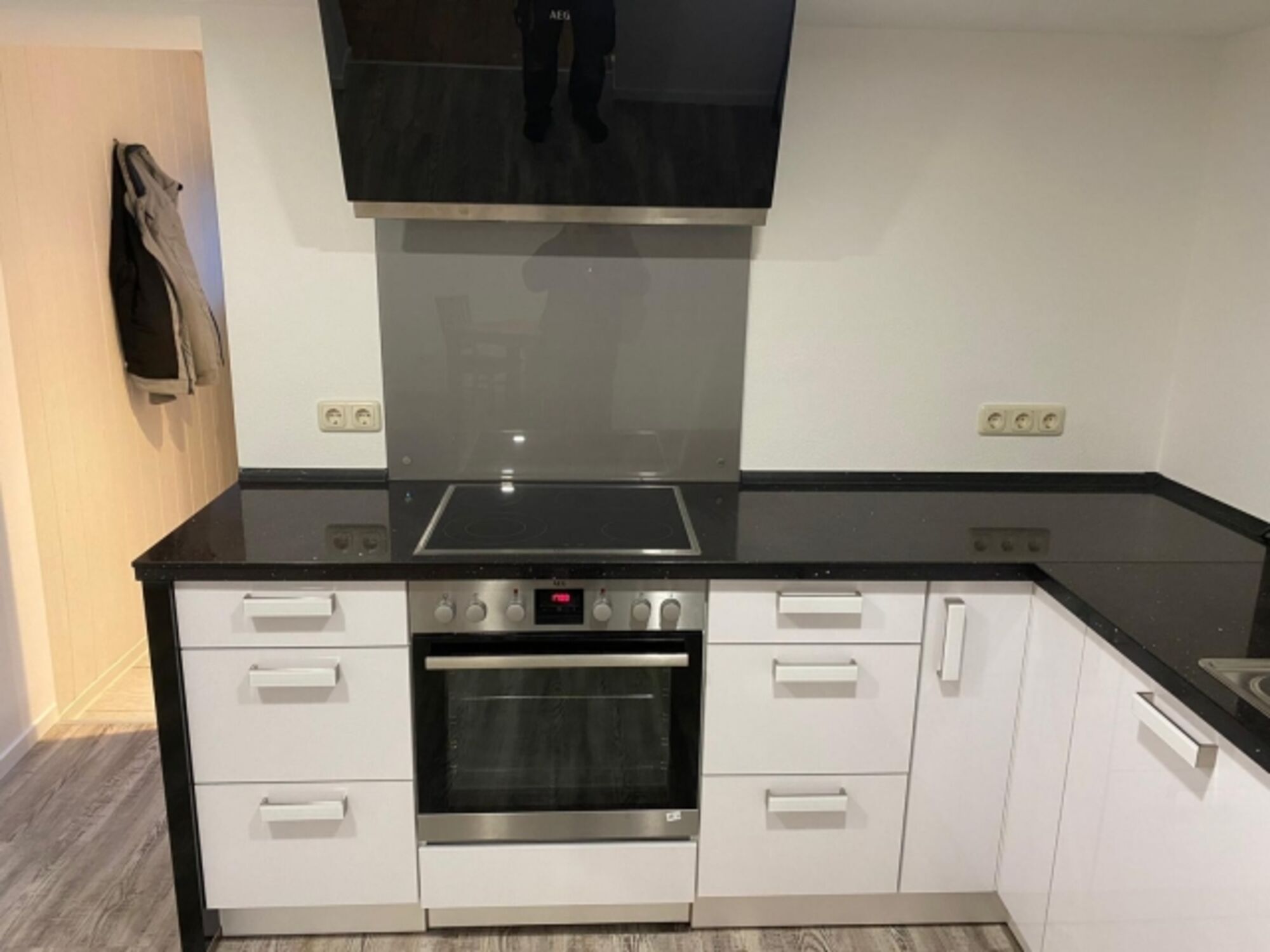Cerankochfeld, Dunstabzugshaube, Kühlschrank mit Gefrierfach, Korkenzieher / Flaschenöffner, Gewürze (Salz, Pfeffer, Zucker), Mülltüten