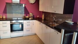 Die hochwertige Küche ist sehr gut ausgestattet und hat neben einem modernen Herd auch eine sehr schöne grope Spülmaschine. Alles Markengeräte inkl. Franke-Spüle. Großer Kühlschrank mit Gefrierfach.