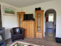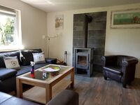 Der Kaminofen im Bungalow lädt auch zu schönen Abenden ein. Sat-TV und Radio sind ebenfalls vorhanden. Eine Schlafcouch kann zur Aufbettung genutzt werden.