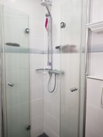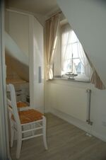 Das separate Schlafzimmer im Obergeschoss enthält ein Bett sowie eine Arbeitsecke mit Tisch. Das Bad ist mit Dusche und WC sowie einem Fön ausgestattet.