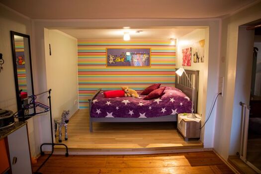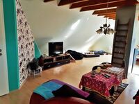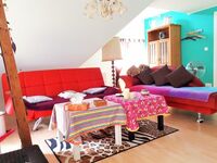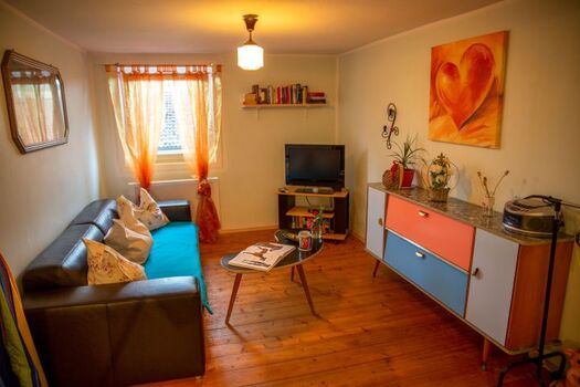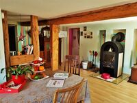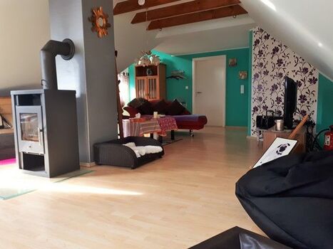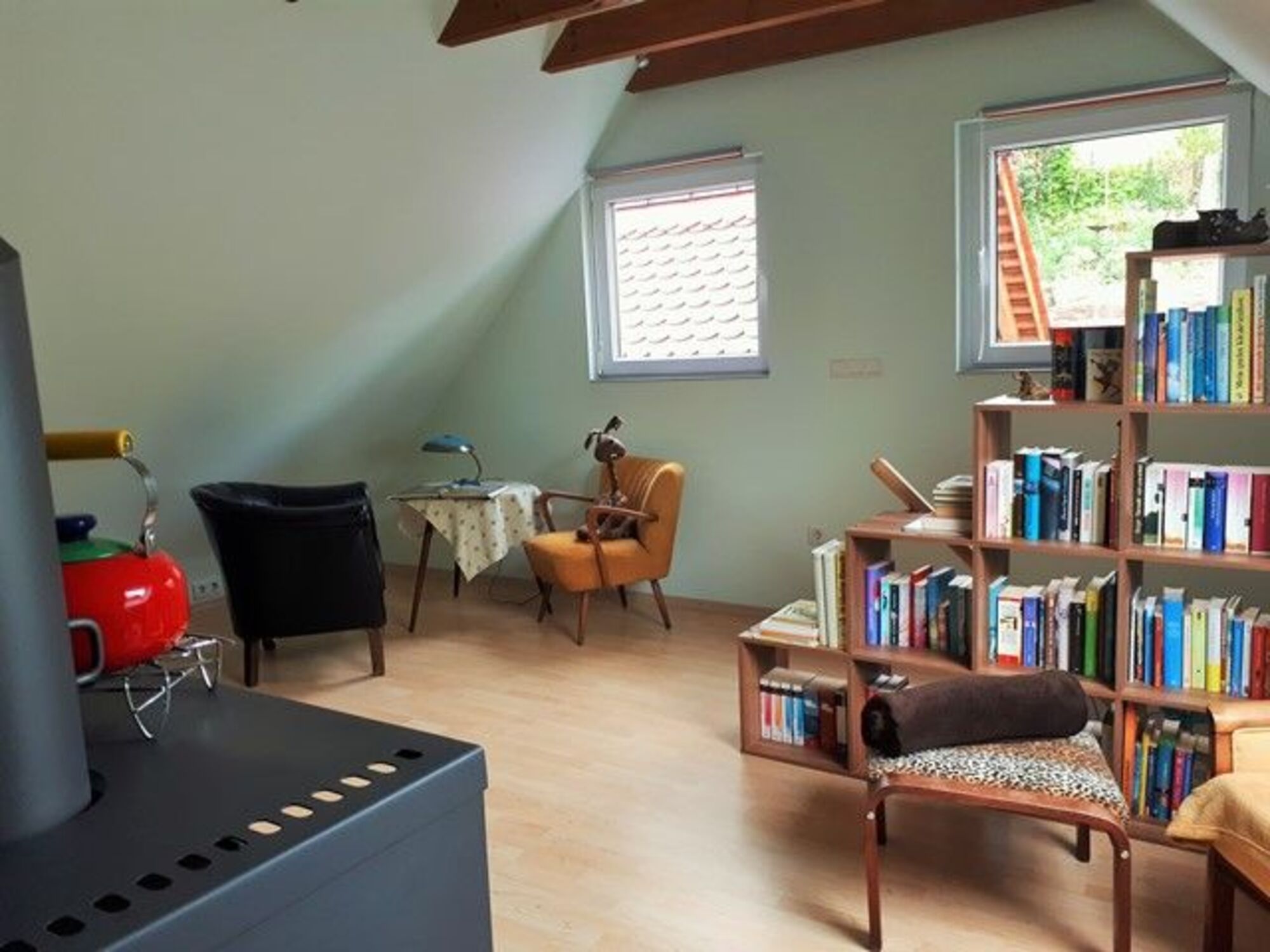 Das Wohnzimmer ist mit Kaminofen und Lese-Ecke eingerichtet. Es ist einiges an Büchern vorhanden, Kinderbücher, Krimis usw. von allem Etwas. Spiele stehen auch einige zur Verfügung. Ebenso DVD´s und CD´s. Es verfügt über ein Schlafsofa, auf dem zusätzlich jemand schlafen kann und einem Ottomane. Für die vierbeinigen Gäste ist eine kleine extra Ecke eingerichtet, die gerne angenommen wird.