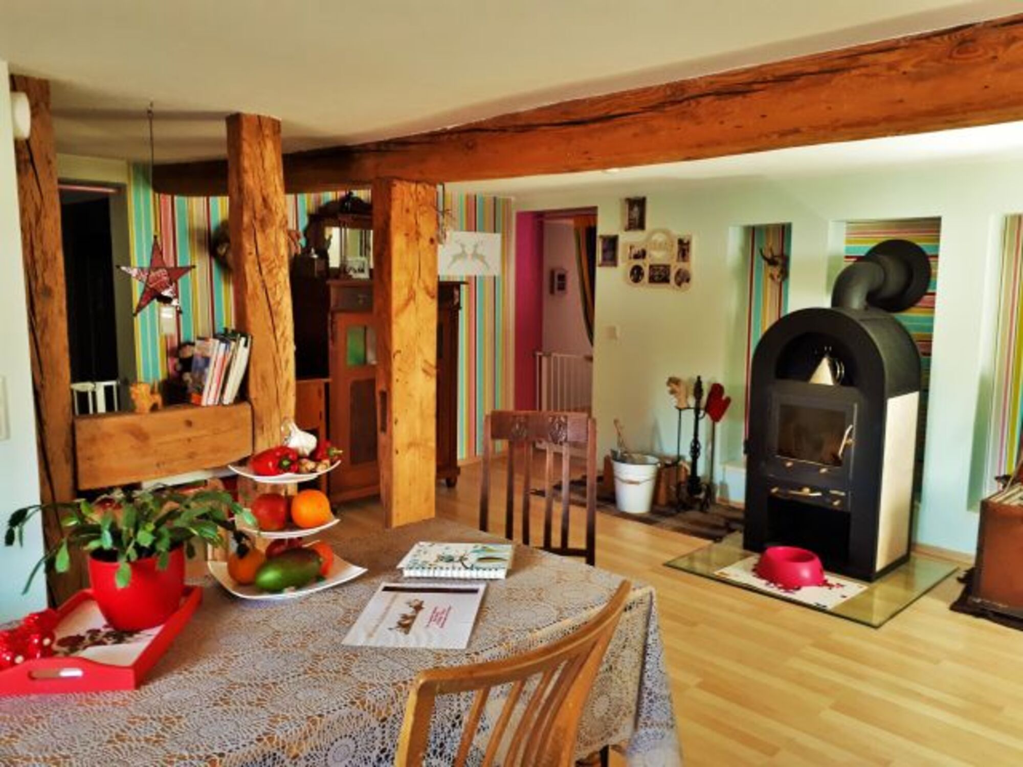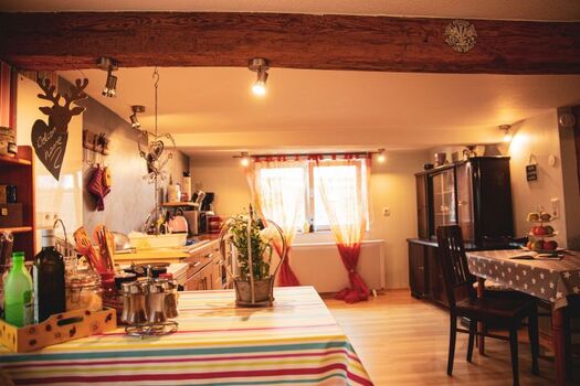 Die Wohn-Essküche ist mit allem Notwendigen ausgestattet. Ein 4-Platten Elektro-Herd mit Backofen, Mikrowelle, Senseo Kaffeemaschine, Filterkaffeemaschine, Kühlschrank mit Eisfach, Radio mit CD, Toaster, Wasserkocher. Kaffee, Tee und Gewürze, ein Geschirrtuch und Spülschwamm stehen ebenfalls zur Verfügung. Natürlich haben wir auch für unsere kleinen Gäste einen Trip Tap Stuhl ! Ein Kaminofen sorgt für eine gemütliche Wärme.