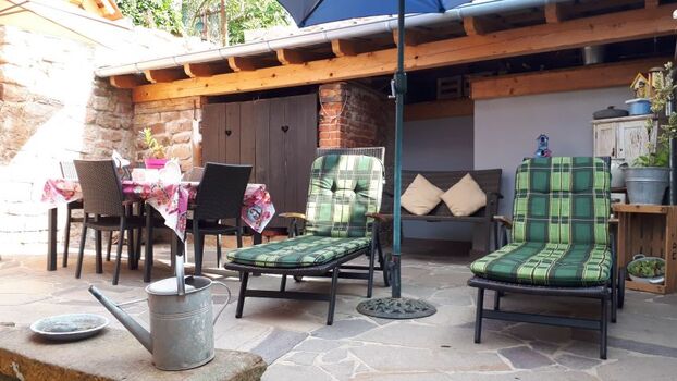 Die große Terrasse ist für Hunde ausbruchsicher und lädt zu gemütlichen Grillabenden und zum Relaxen ein. Sie ist mit einem Grill, mehreren Sonnenliegen und einem Esstisch mit Stühlen und Sonnenschirmen ausgestattet.