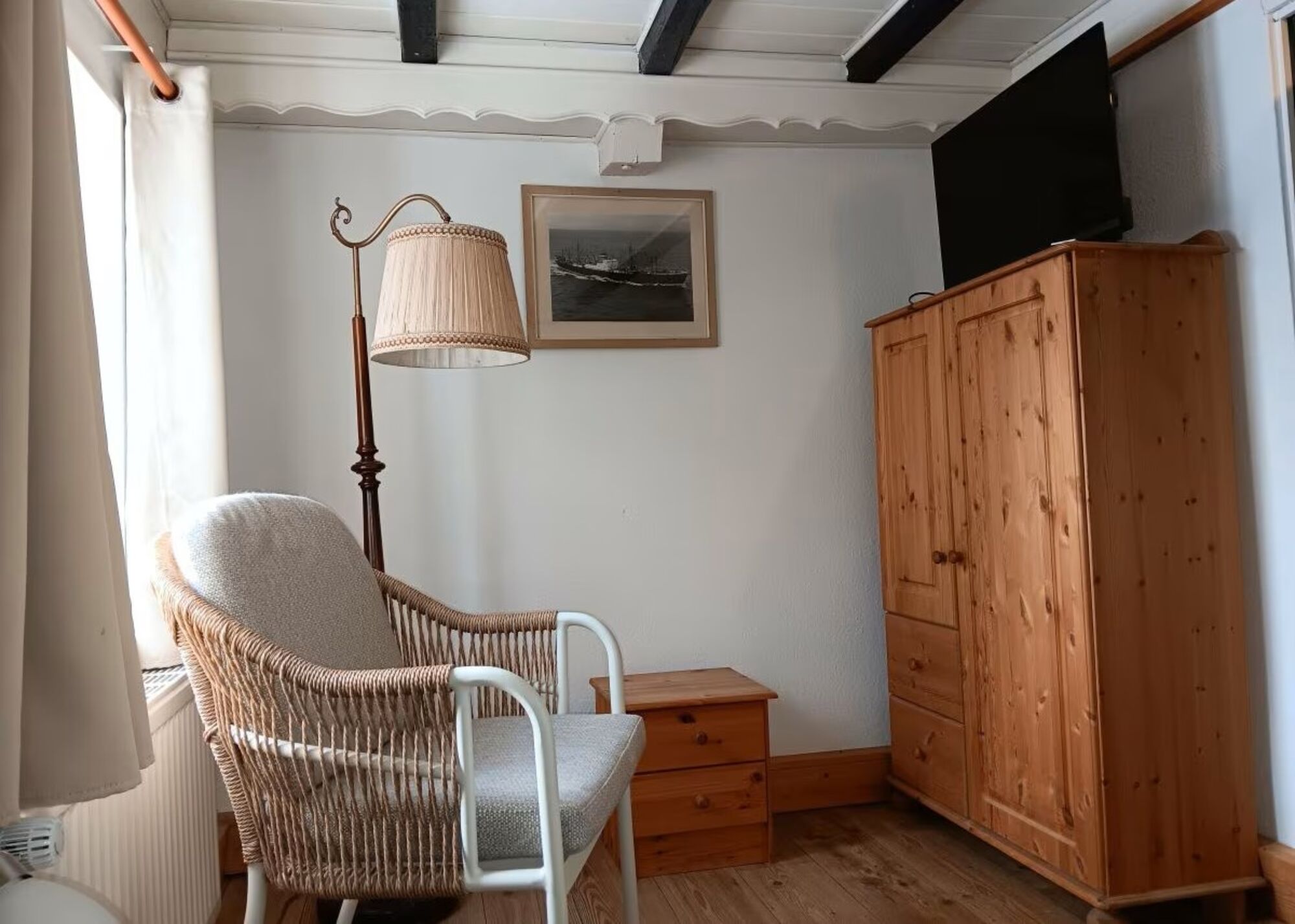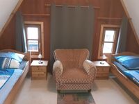 Die Zimmer im Erdgeschoss sind ca. 2 m hoch. (die Türstürze ca. 175-180, cm ) Zum Dachgeschoss ( Deckenhöhe 2,30 m) mit dem gemütlichen Wohnzimmer mit Leseecke und einem weiteren Schlafzimmer mit 1 Einzelbett führt eine steile Treppe. Die Sackgasse, in der die Kate steht, wird im Volksmund die kleine Märchenstraße genannt. Im weiteren Verlauf der kleinen Sackgasse Kuhlenreihe stehen weitere kleine denkmalgeschützte ehemalige Tagelöhnerhäuser. Nur 20 m von der Kate entfernt ist ein großer idyllischer See. Direkt am See befindet sich das seperate romantische Seegrundstück der Reetdachkate mit Gartenmöbeln, Strandkorb , Sonnenliegen und Grill.
