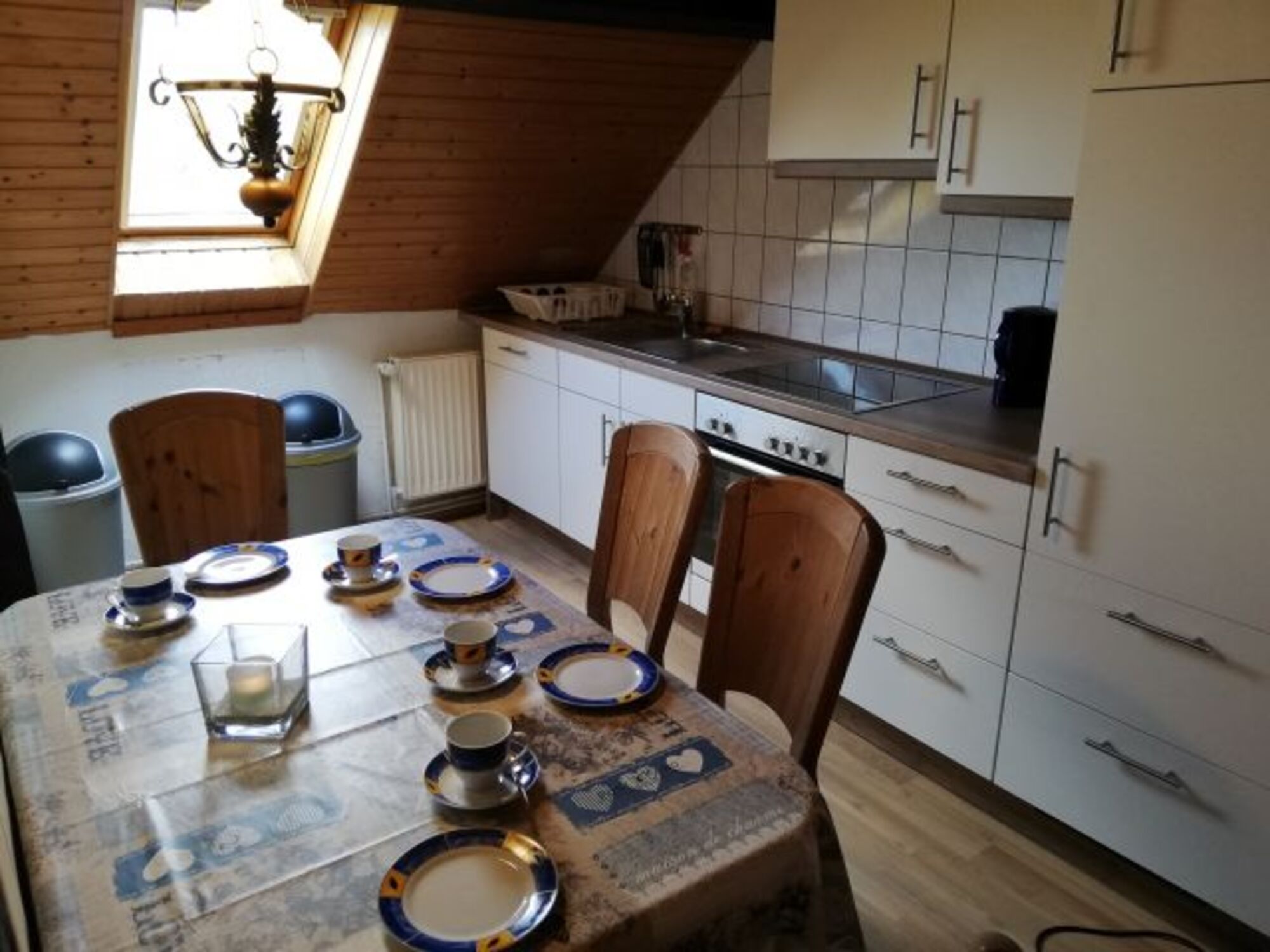 4-Platten Herd, Cerankochfeld, Kühlschrank mit Gefrierfach, Gefrierschrank, Senseo-Kaffeeautomat, Eierkocher, Geschirrhandtücher, Mülltüten, Essplatz in der Küche