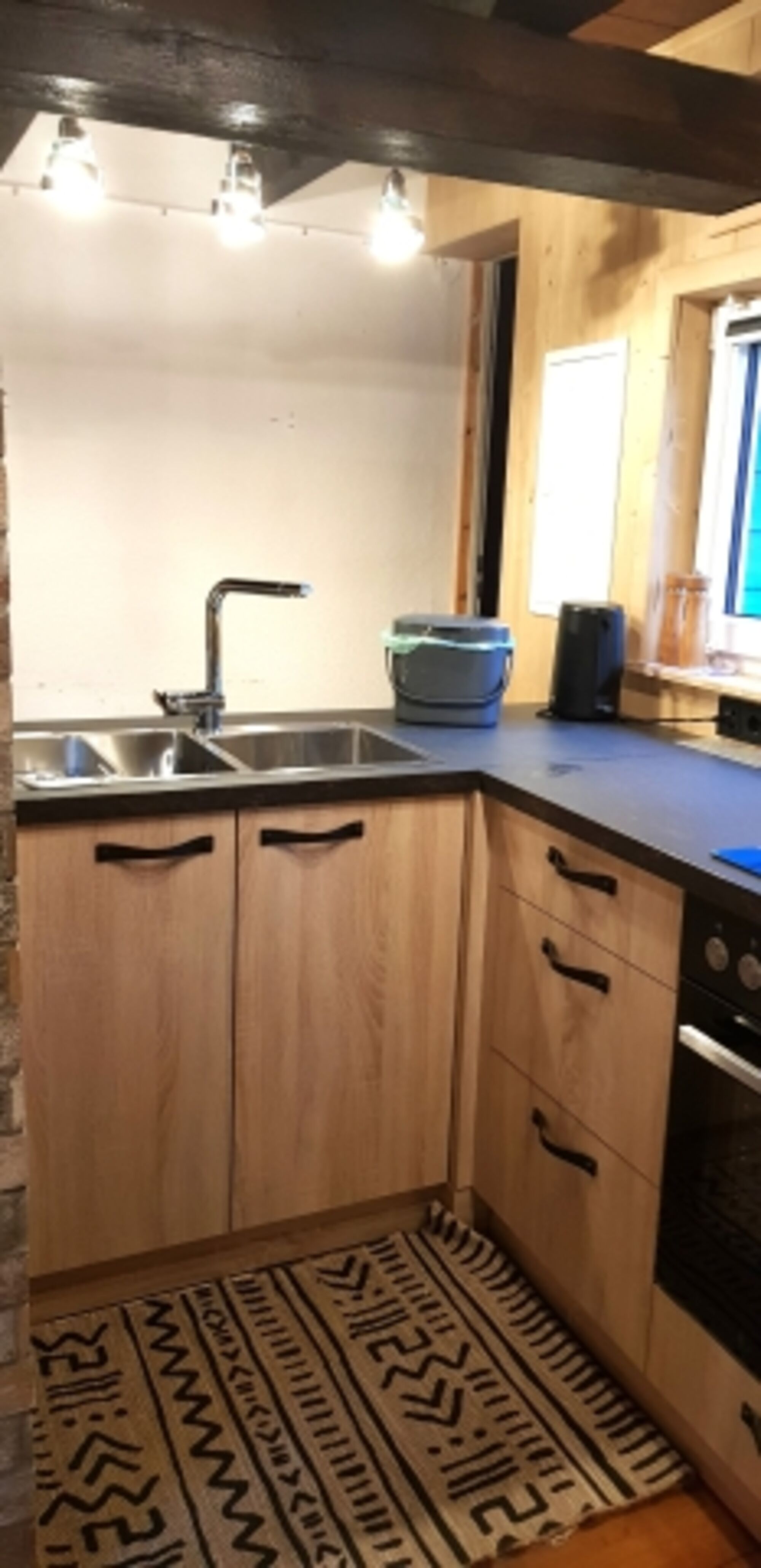 Die Schlafmöglichkeiten verteilen sich auf das Schlafzimmer im Obergeschoss mit einem Doppelbett (180x200cm) und auf die ausziehbare Couch im Wohnbereich (Erdgeschoß)