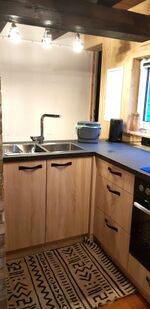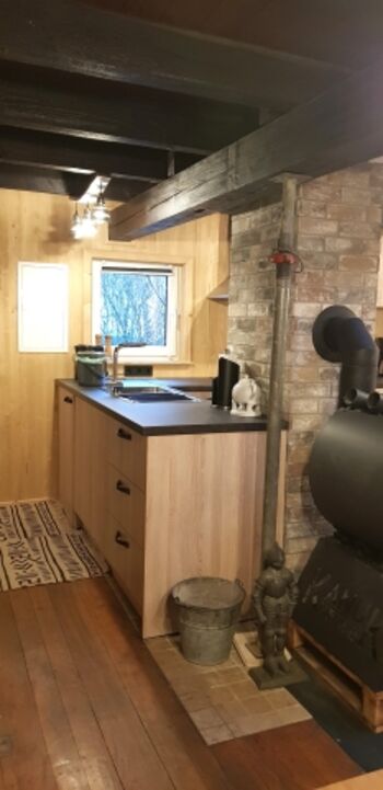 Gleich morgens lädt die überdachte Terrasse ein den Tag mit einem ausgedehnten Frühstück zu beginnen. Bei schlechtem Wetter schmökern Sie mal im Bücherregal, kuscheln vor dem Fernseher oder surfen im Internet und das alles mit einem knisternden Feuer im Kamin. Wenn Ihnen das Herz nach einem langen Spaziergang durch Wald und Wiesen steht, gibt es nichts Entspannenderes als anschließend in der Sauna den Tag ausklingen zu lassen. In der gut ausgestatteten offenen Küche finden Sie einen Herd mit Backofen, eine Kaffeemaschine mit Filterpapier, einen Toaster, einen Wasserkocher nebst Geschirr und Töpfen. Das Bad verfügt über eine Dusche mit Regendusche und Waschbecken. Die Gäste-WC ist separat.