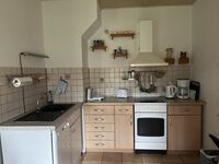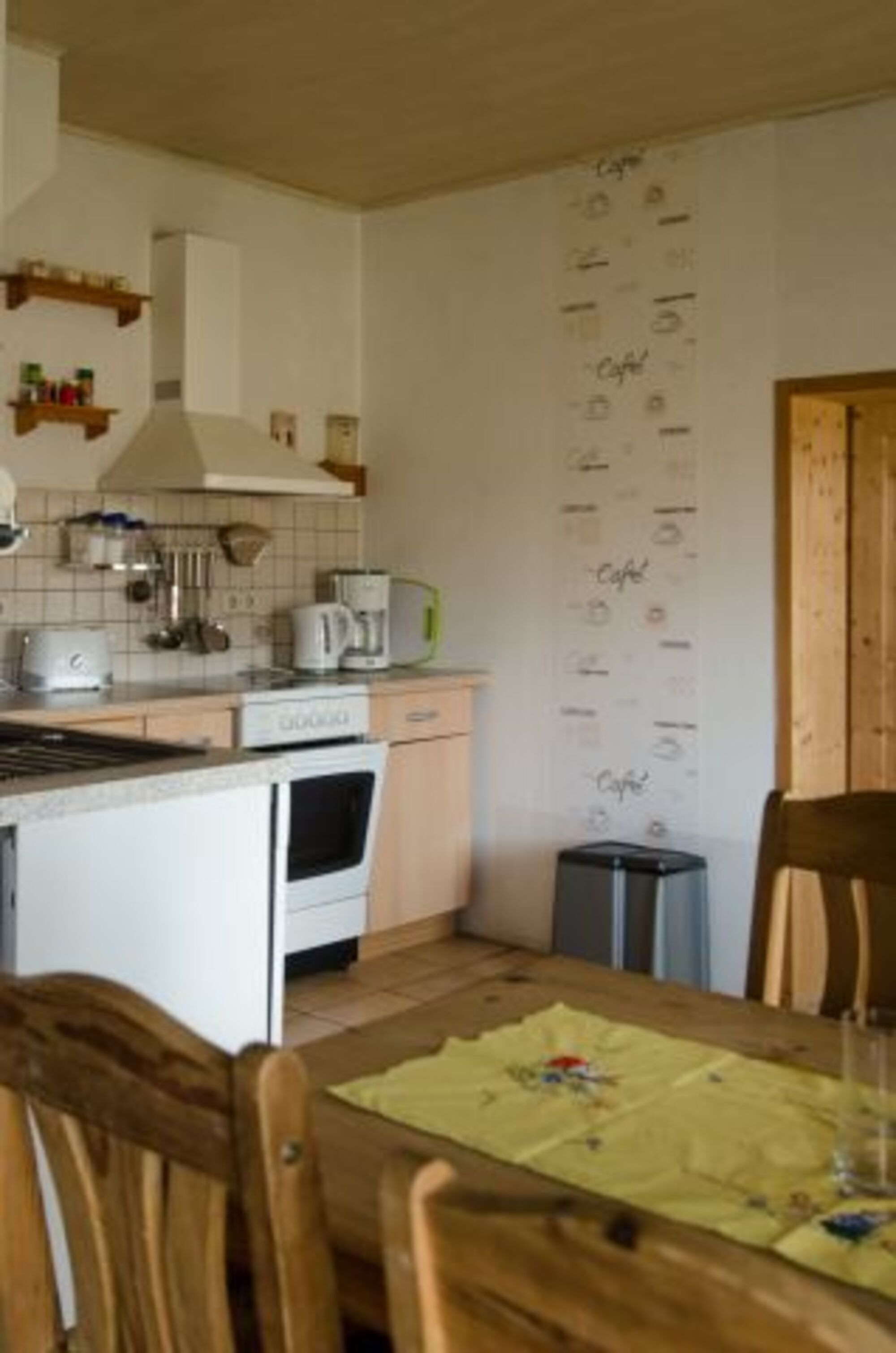 Cerankochfeld, Dunstabzugshaube, Kühlschrank mit Gefrierfach, Eierkocher, Korkenzieher / Flaschenöffner, Gewürze (Salz, Pfeffer, Zucker), Mülltüten, Essplatz in der Küche