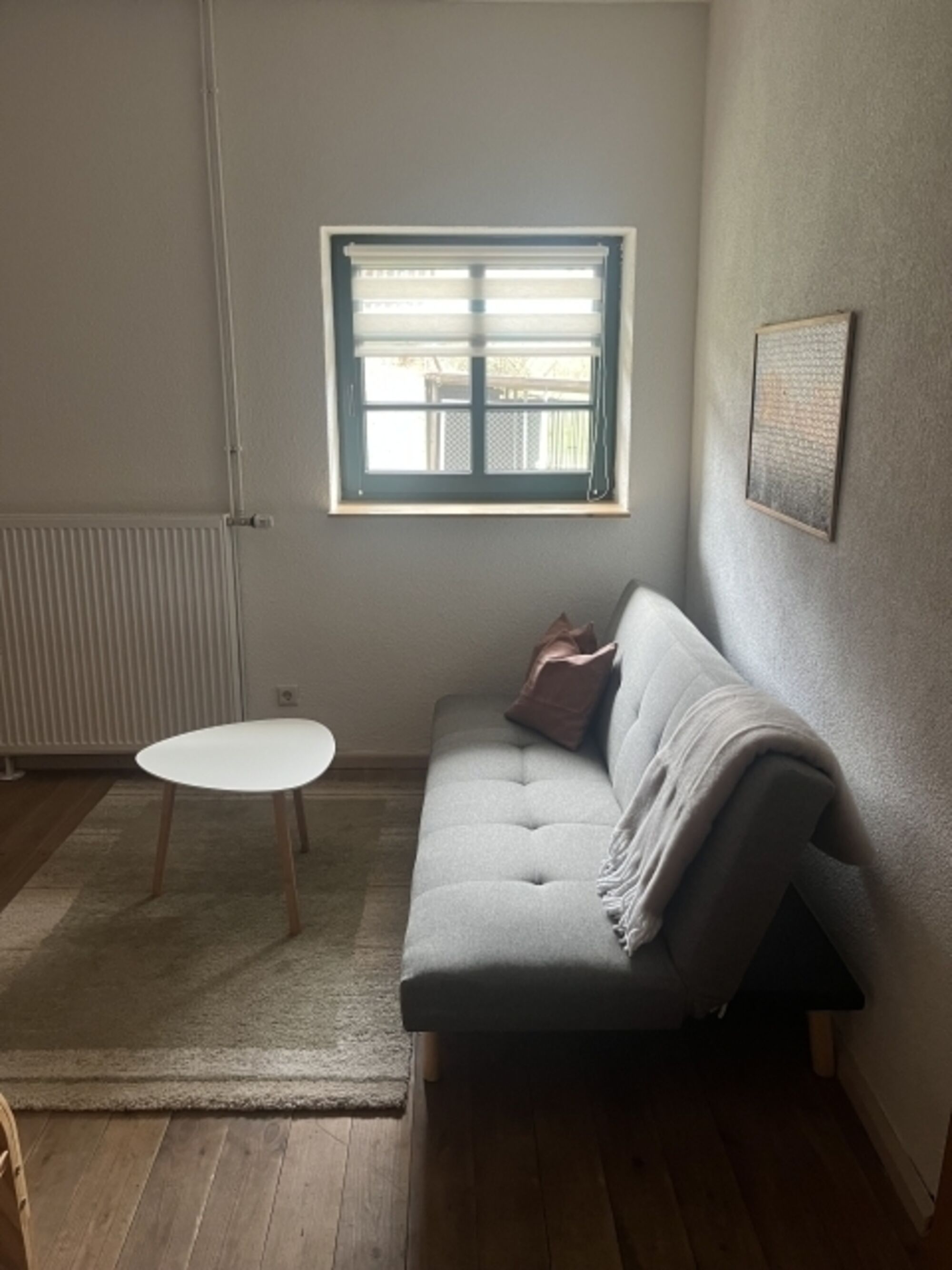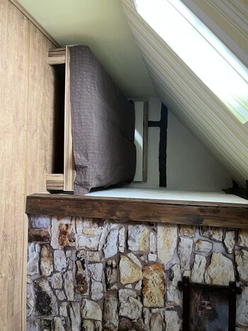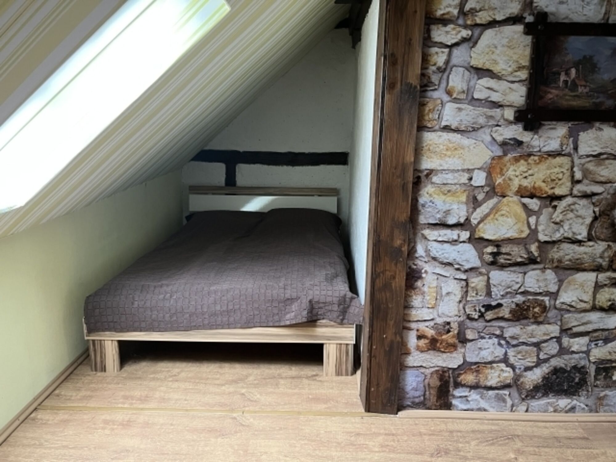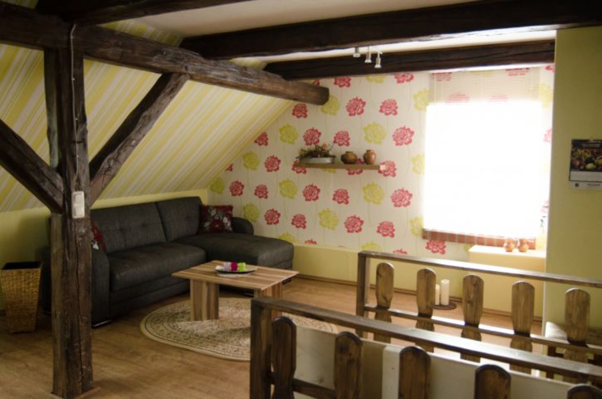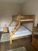 Das Zimmer befindet sich im ausgebauten Dachboden. Es ist ein Schlaf- Wohnraum, eingerichtet mit Schrank, Anrichte, Couch , Tisch und einem Doppelbett. Außerdem können Sie hier sportlichen Aktivitäten nachgehen, da dort ein Fahrradtrainer und ein Kicker stehen. Doppelbett 1,40 x 2,00m