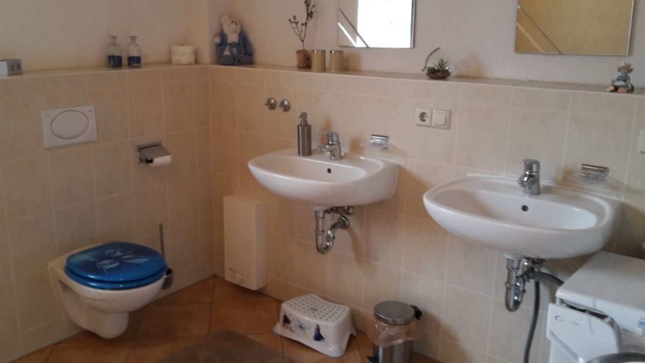 Das Bad ist vollständig gefliest. Dusche, Eckbadewanne, WC , 2 Wascbecken, 2 Spiegel , Hadtuchtrockner und Badregal sind vorhanden; ebenfalls eine Waschmaschine. Handtücher können Sie gern dazubuchen. Doppelwaschbecken, Spiegel, Fenster im Bad