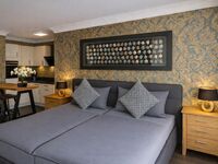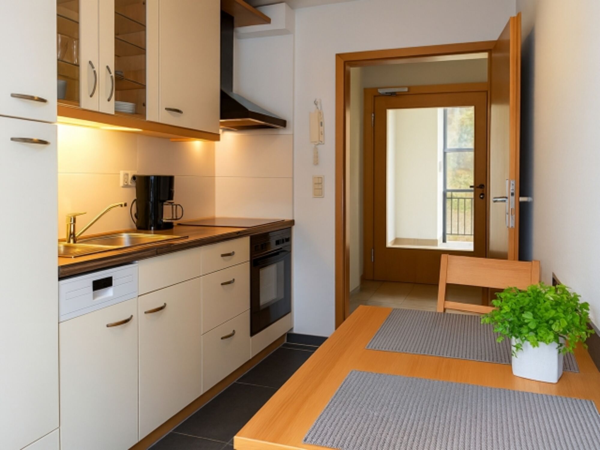 Im separatem Eingangsbereich befindet sich eine komplett ausgestattete Küchenzeile mit Spülmaschine, Ceranfeld, Backofen, Essecke usw.
