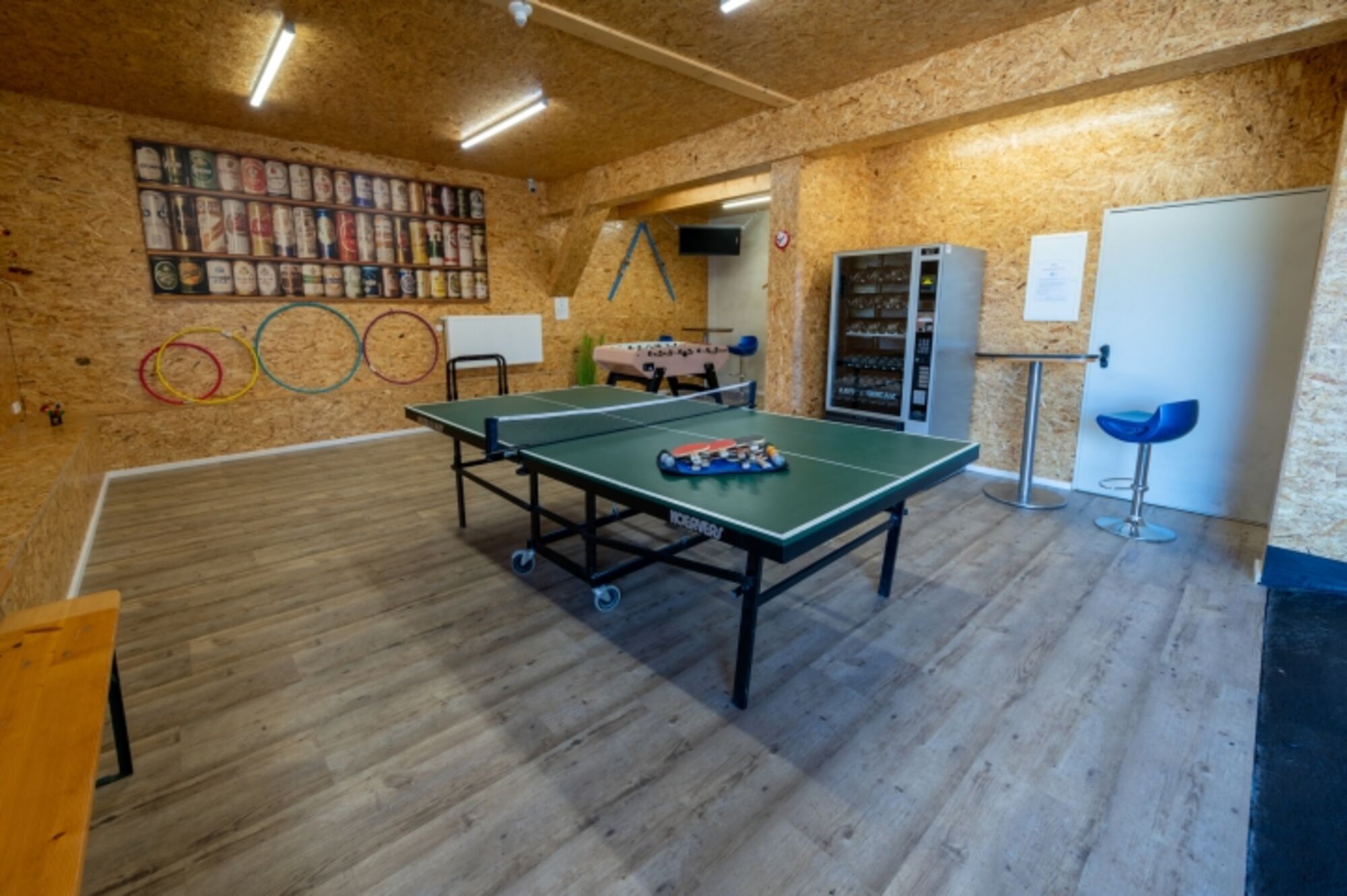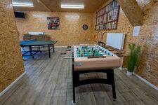 Ein absolutes Highlight ist der offene Kamin, der nicht nur für eine behagliche Atmosphäre sorgt, sondern auch die Möglichkeit bietet, köstliche Pizzas zu backen – eine besondere Freude an kälteren Tagen. Der Raum ist zudem mit einem Billardtisch und bequemen Hängesesseln ausgestattet, die zum Entspannen einladen.