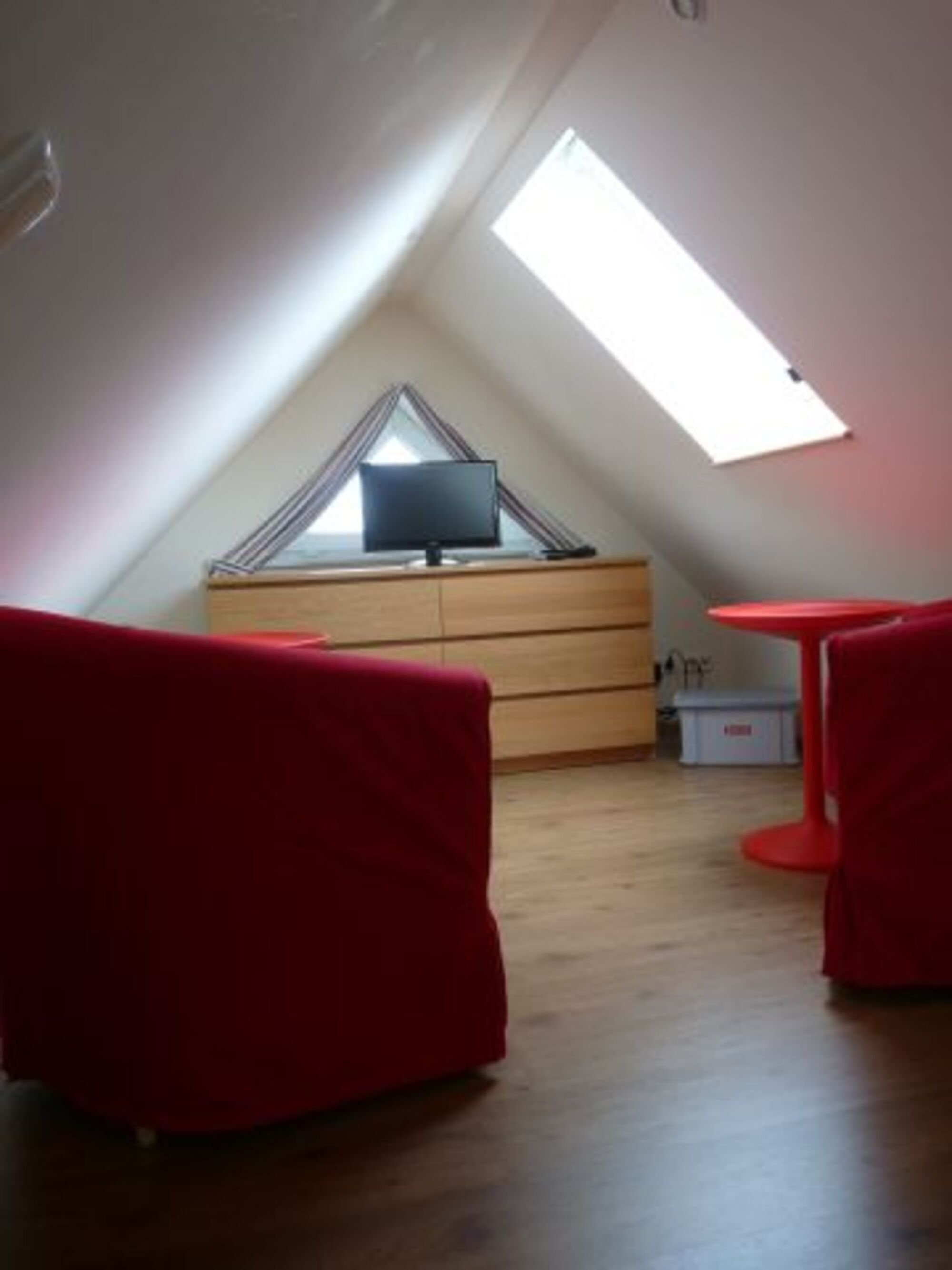 Studio: zwei Einzelbetten (zusammenschiebar), 2 Sessel, Fernseher. Es gibt keine trennende Tür zwischen Studio und Treppenaufgang/Flur.