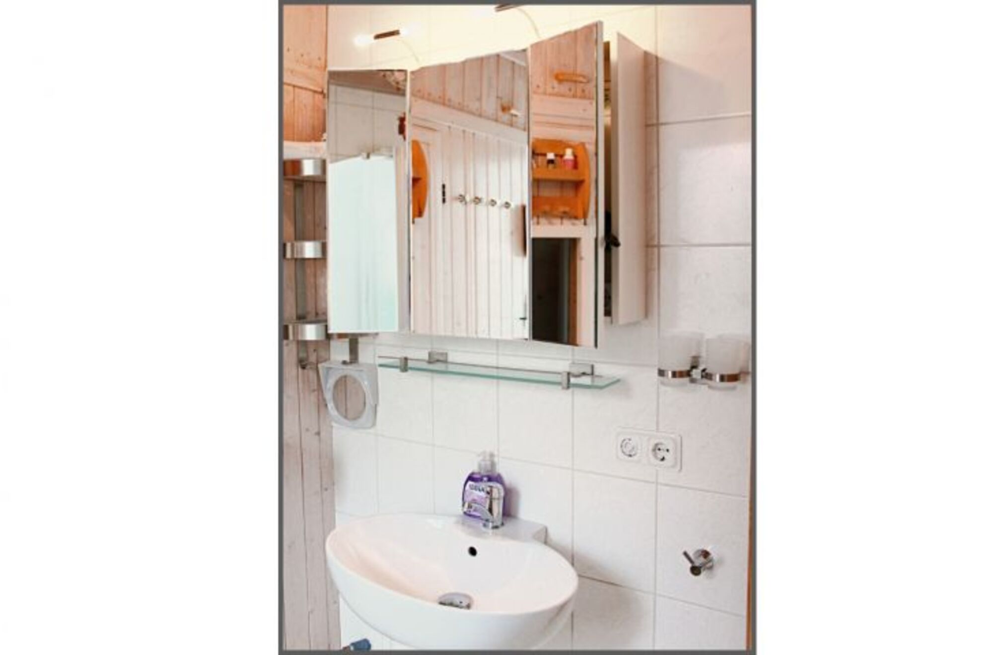 Im Bad befindet sich eine Wellness-Dusche, WC, ein Waschbecken und eine großzügige Sauna.