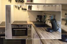 4-Platten Herd, Induktionsherd, Dunstabzugshaube, Kühlschrank mit Gefrierfach, Senseo-Kaffeeautomat, Mixer, Korkenzieher / Flaschenöffner, Gewürze (Salz, Pfeffer, Zucker), Öl / Essig, Mülltüten, TV in der Küche