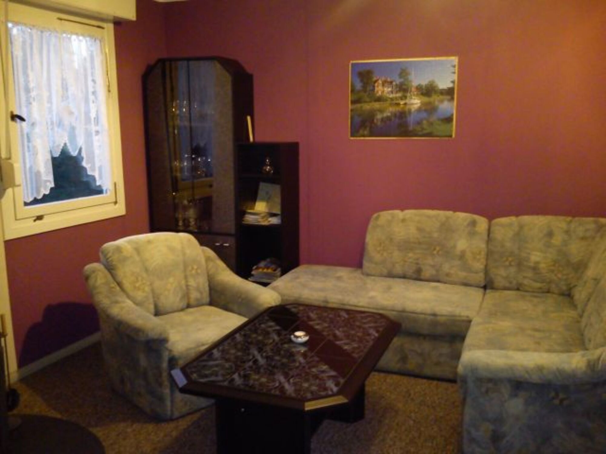 TV-Sat, Bücher, Kaminofen, Eckcouch, Sessel, Fliegengitter