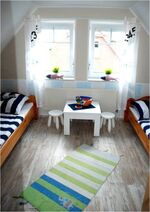 Im Obergeschoß befinden sich das Schlafzimmer 'Klabauterkiste' mit zwei Einzelbetten, Spielzeug für Ihre Kinder und einem CD-Player. Das kleine maritime Bad ist ausgestattet mit Dachfenster, Dusche und WC. Im Schlafzimmer 'Auszeit' mit großem Doppelbett (1,80 m) und Kleiderschrank steht zudem ein Babybett (inkl. Kissen- & Oberbettinlet). Der Schaukelstuhl lädt dazu ein mal wieder ein gutes Buch in Ruhe lesen zu können oder Ihr Baby in den Schlaf zu wiegen. Die Treppe zum Erdgeschoss ist durch ein Treppenschutzgitter abgesichert.
