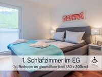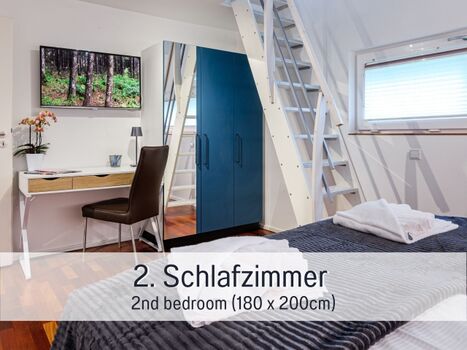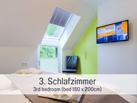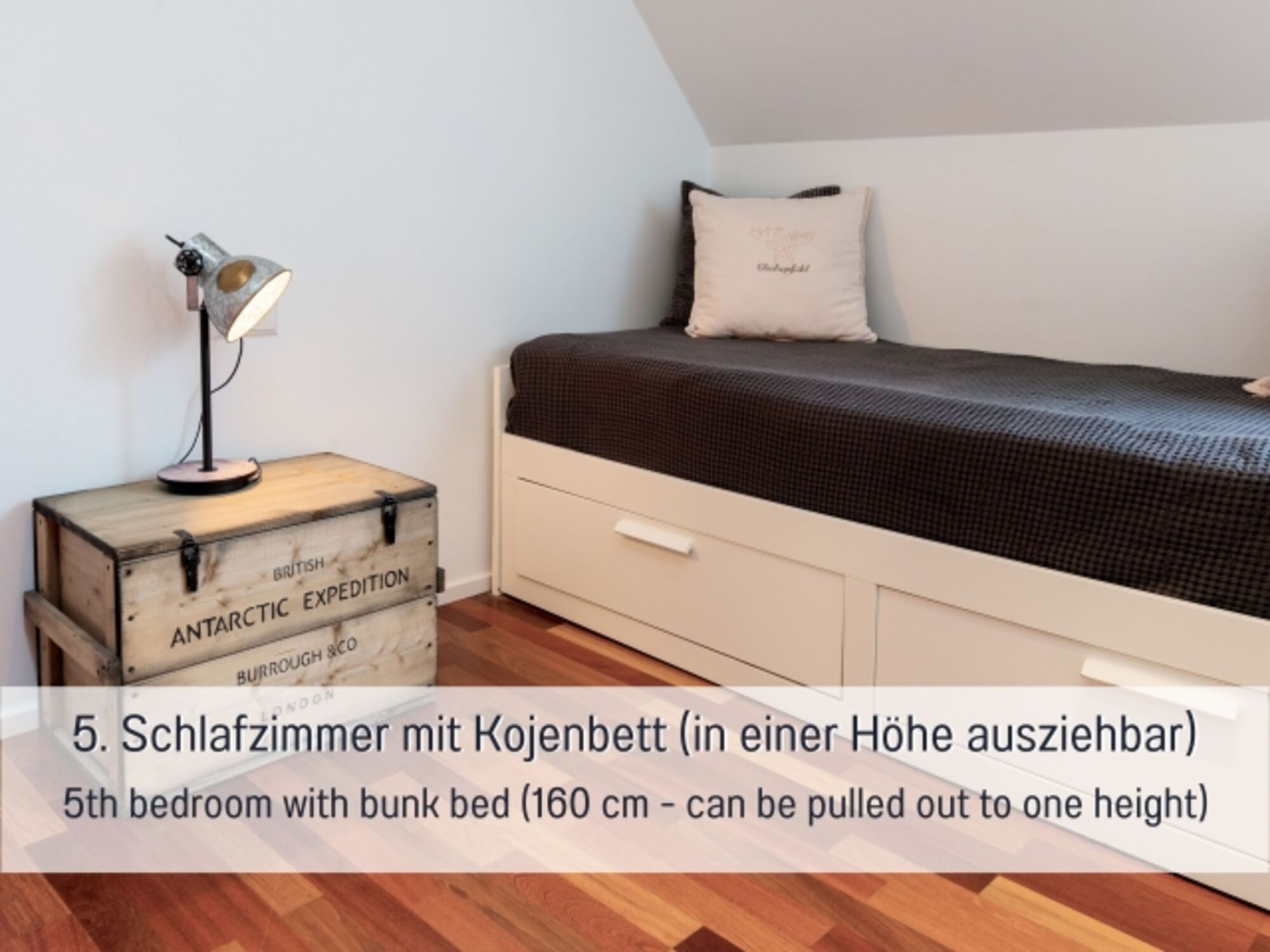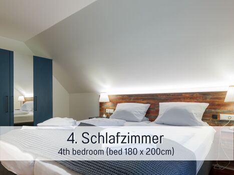 Bei diesem Zimmer gibt es noch eine Schlafempore mit einem Futon (220x200cm) Doppelbett 2,20 x 2,00m, Doppelbett 1,80 x 2,00m, Boxspringbett, Spiegel, Leselampe am Bett, Fliegengitter