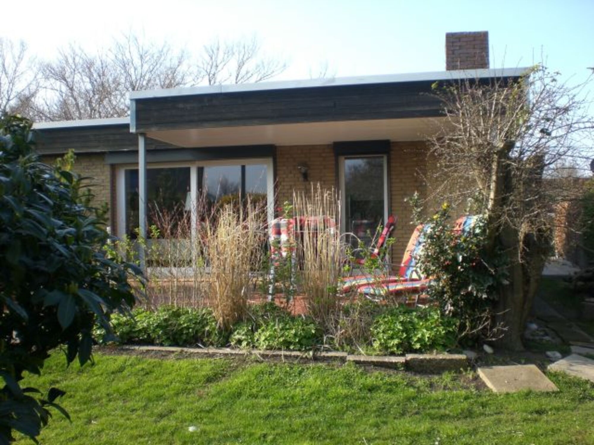 Vom Wohnzimmer aus haben Sie durch eine große Schiebetür Zugang zur teilüberdachten Terrasse mit Außenkamin (komplett ausgestattet mit Gartenmöbeln) und zum eingezäunten Garten.