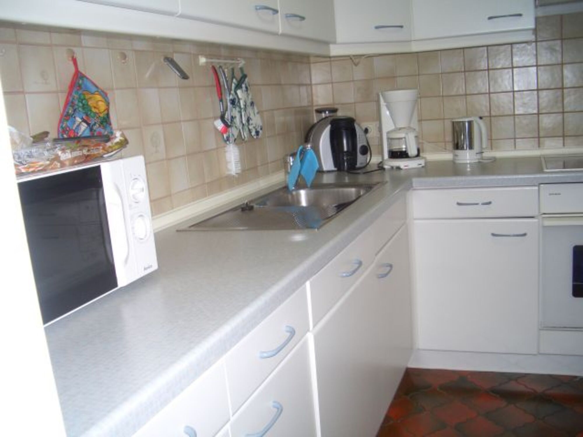 Die Küche ist komplett ausgestattet: Elektroherd mit Ceranfeld und Backofen, Kühlschrank mit Gefrierfach, Spüle, Spülmaschine, Mikrowelle, Kaffeemaschine, Wasserkocher und Toaster.