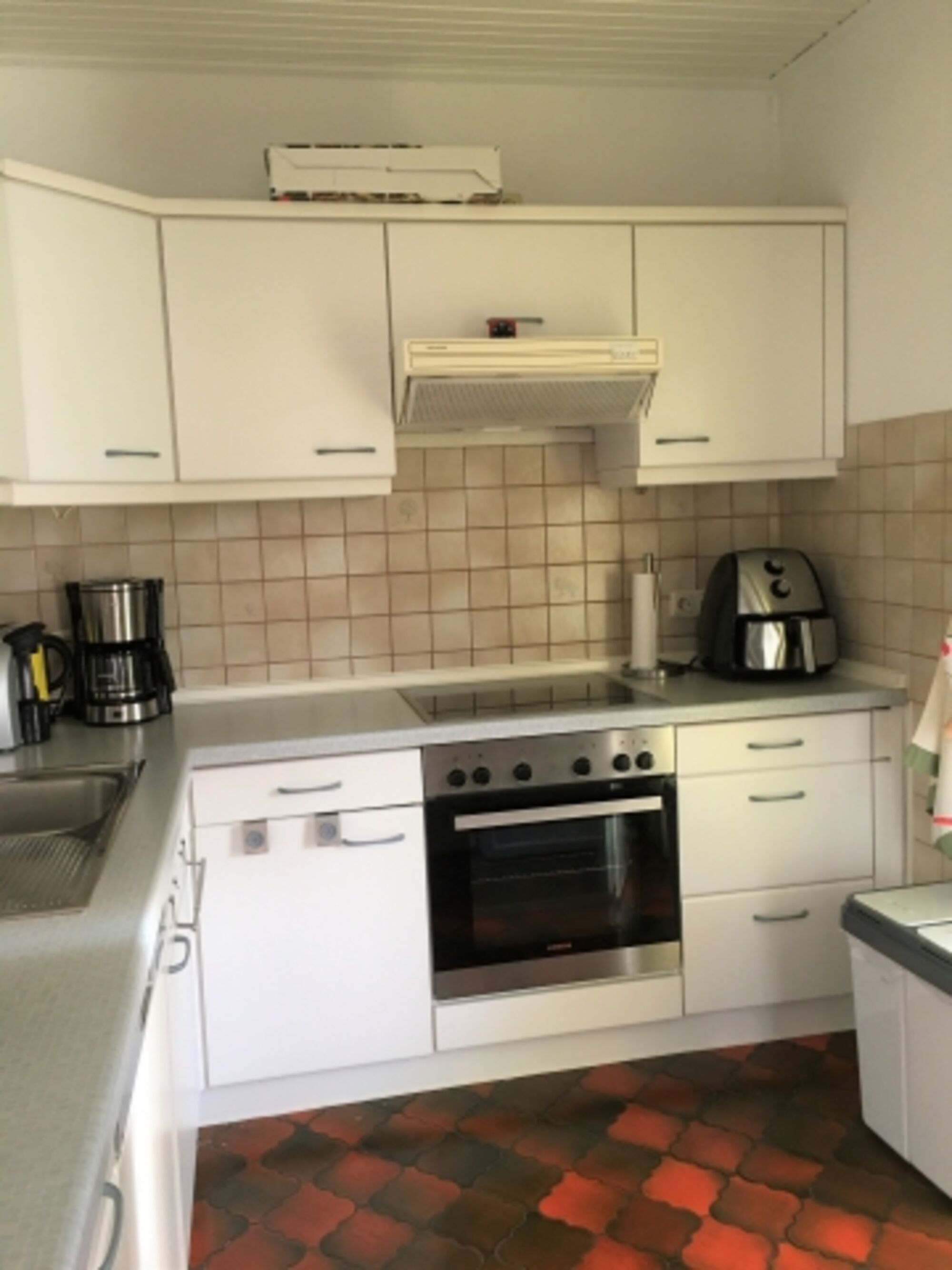 4-Platten Herd, Cerankochfeld, Dunstabzugshaube, Kühlschrank mit Gefrierfach, Tassimo-Kaffeautomat, Mixer, Korkenzieher / Flaschenöffner, Geschirrhandtücher, Mülltüten