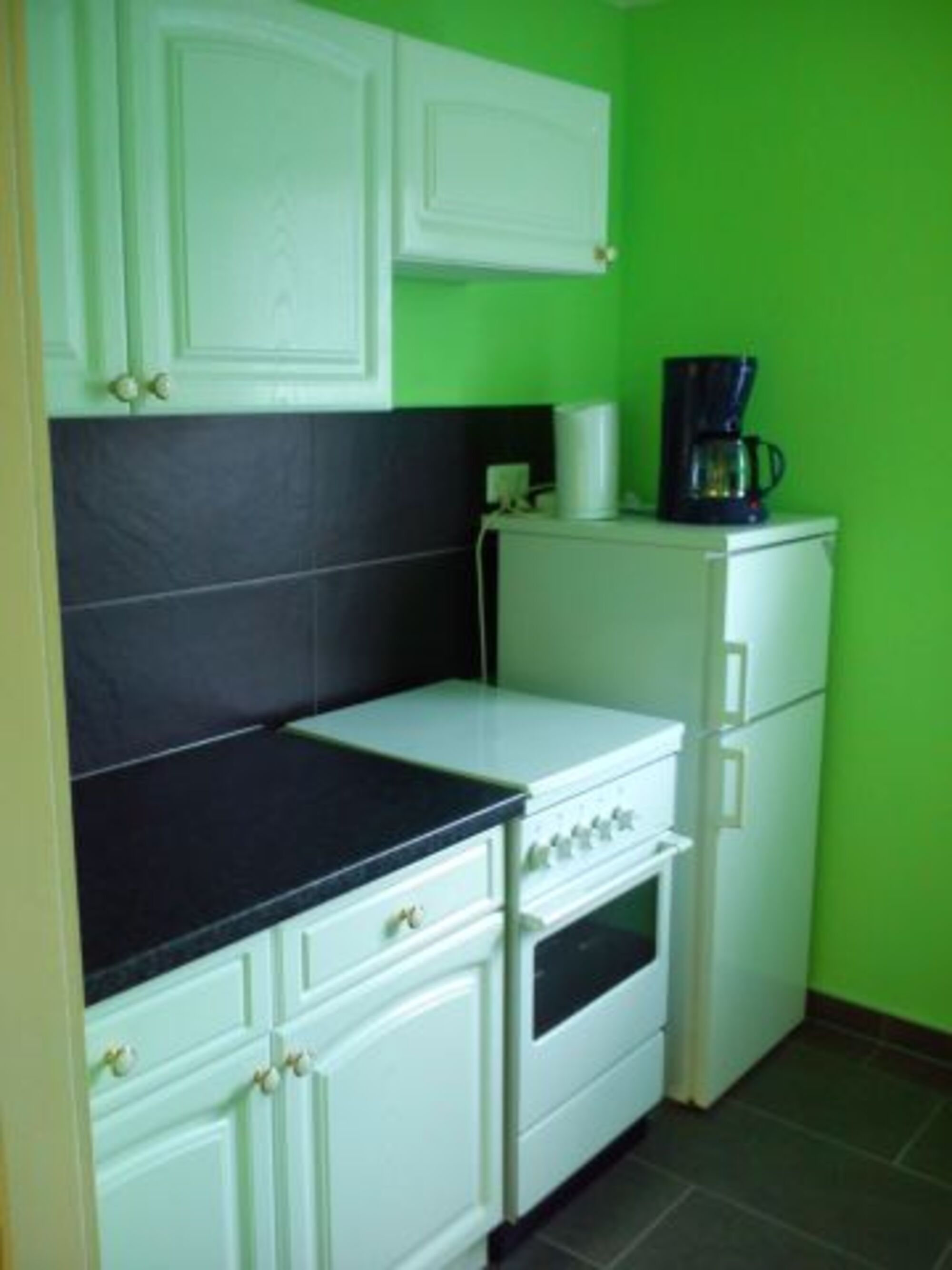 4-Platten Herd, Gasofen / Gasherd, Kühlschrank mit Gefrierfach, Korkenzieher / Flaschenöffner, Gewürze (Salz, Pfeffer, Zucker), Öl / Essig, Mülltüten