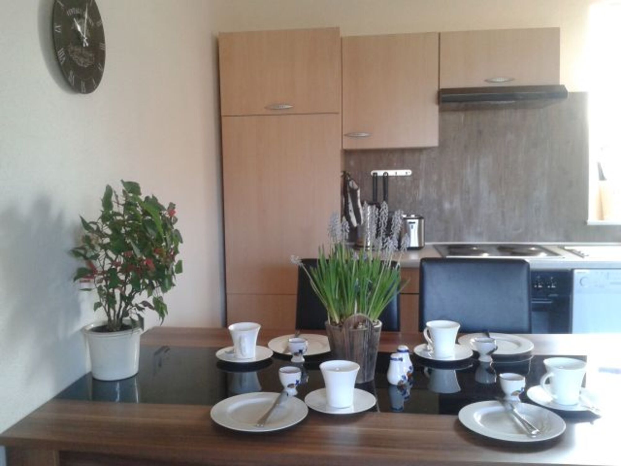 4-Platten Herd, Cerankochfeld, Dunstabzugshaube, Gefrierschrank, Eierkocher, Mixer, Korkenzieher / Flaschenöffner, Gewürze (Salz, Pfeffer, Zucker), Öl / Essig, Geschirrhandtücher, Mülltüten, Essplatz in der Küche