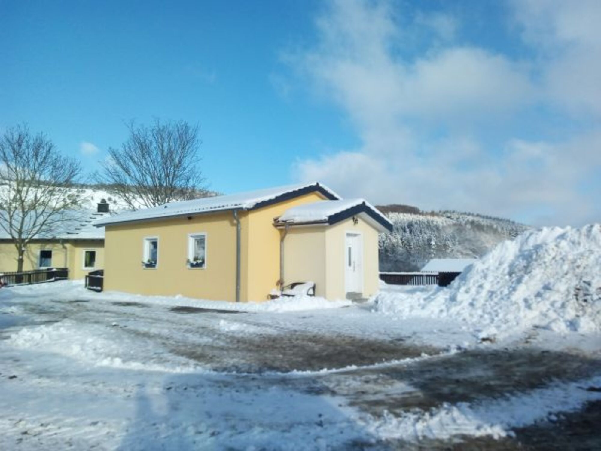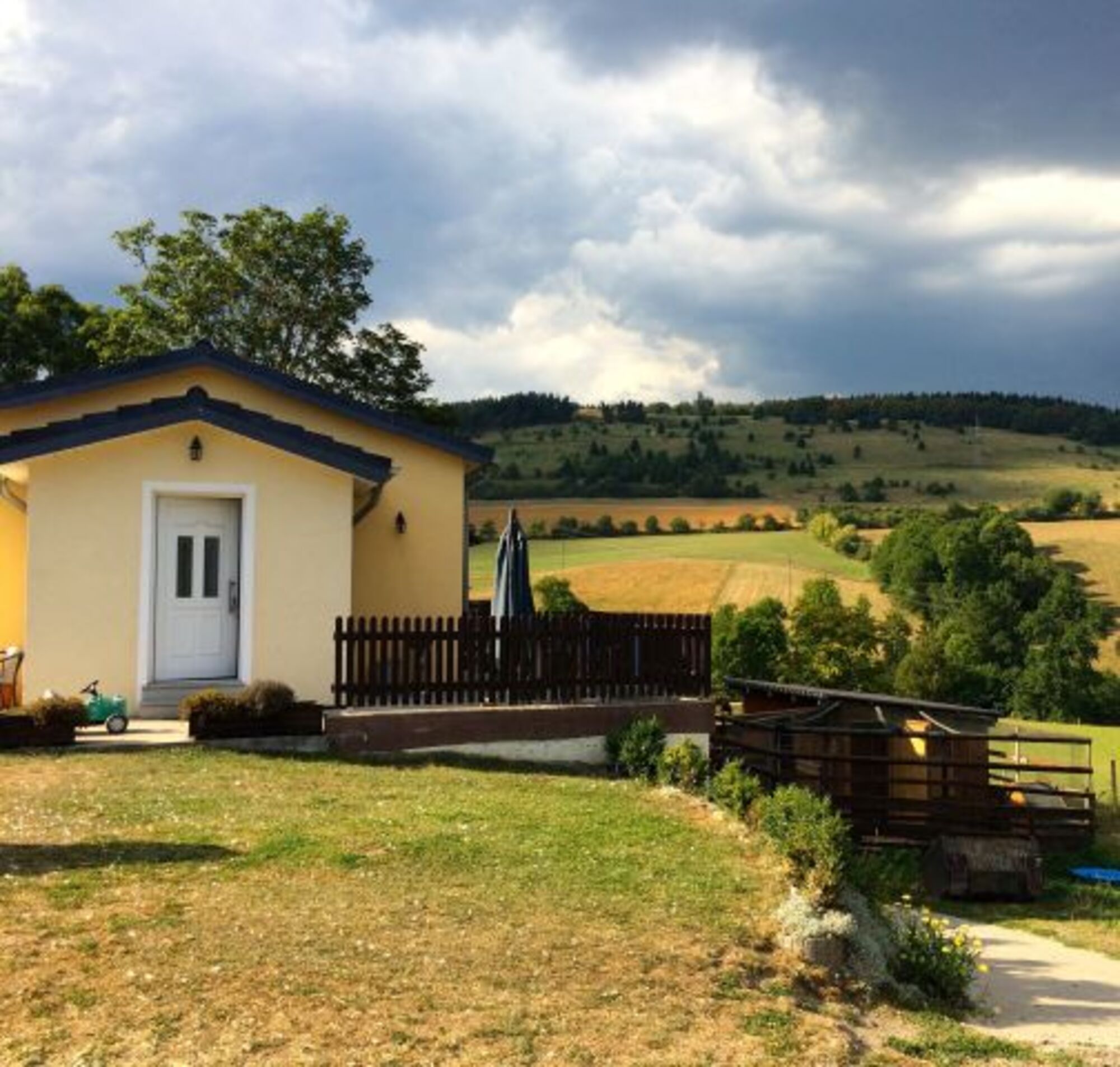 Das gemütliche, 60qm große Ferienhäuschen mit zwei Schlafräumen, einem großen Wohn-Esszimmer und einem hellen Tageslichtbad wurde 2010 neu gebaut und steht frei auf dem Hofgelände. Aus allen Fenstern und von der beleuchteten Terrasse aus können Sie weit in die hügelige Landschaft, auf die weidenden Milchkühe und Ponys schauen
