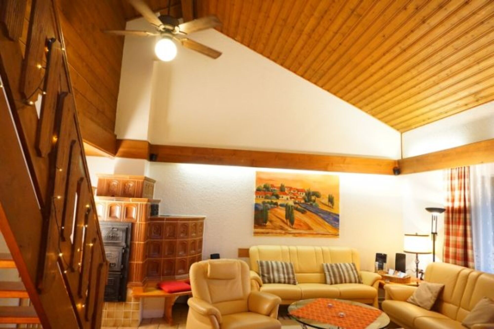 Neben einer ebenerdigen Terrasse und einem geräumigen Wohnbereich mit heimeligen Kachelofen verfügt unser Ferienhaus über eine Küche, ein Schlafzimmer mit Doppelbett, einem Galerieraum mit Doppelbett und Zusatzbett, sowie ein Kinderzimmer mit Etagenbett (und bei Bedarf einem Auszugsbett).