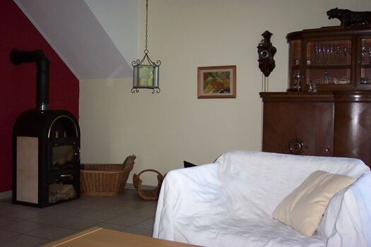 Wohnzimmer mit Sofagarnitur, Leder-Relax-Sessel, Kaminofen, Flachbild-TV, Radio,