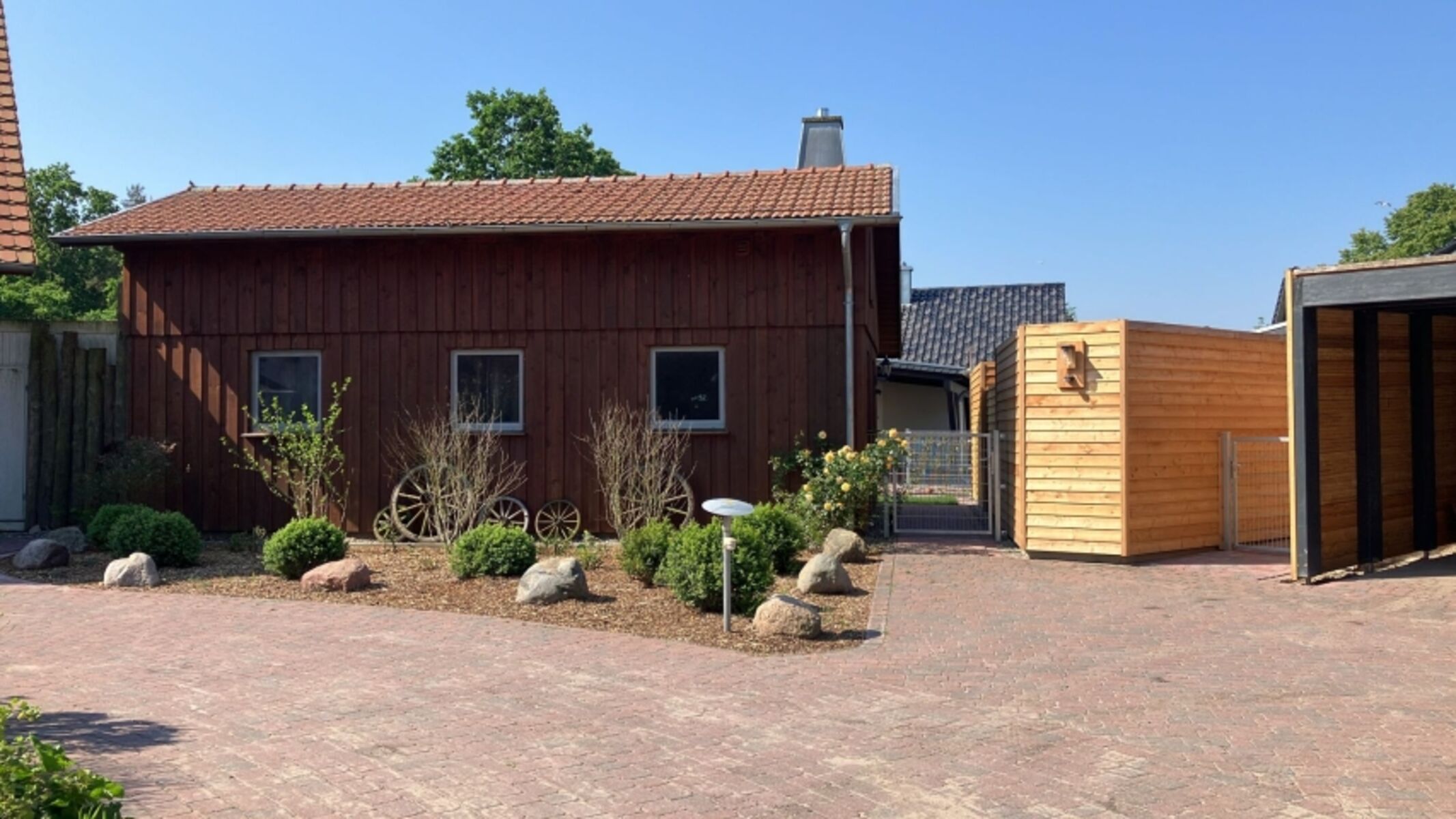 Das Ferienobjekt liegt auf dem Grundstück der Eigentümer. Dort leben Pferde und zwei liebe Hunde.