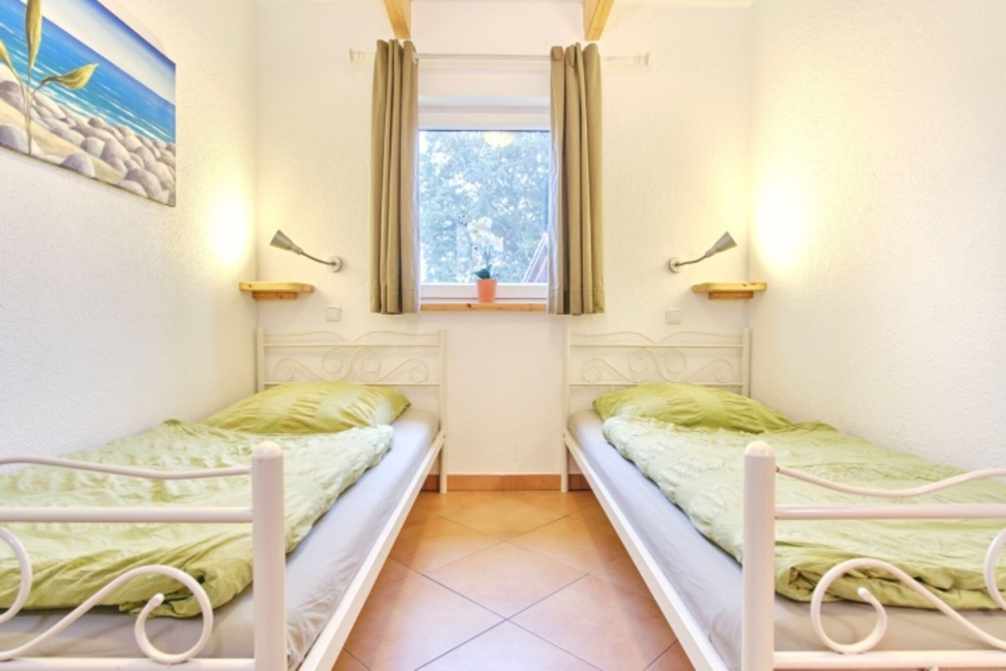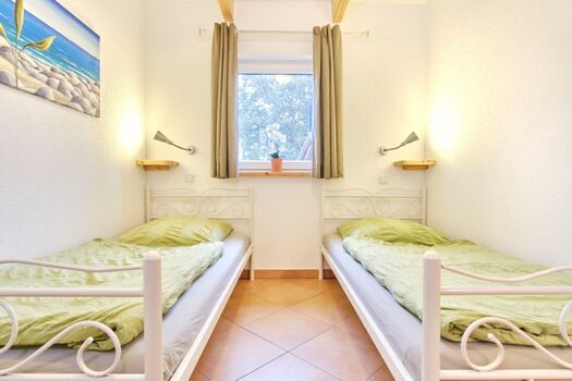 Schlafräume: 1 Schlafraum mit 1 Doppelbett, 1 Schlafraum mit 2 Einzelbetten; Fußböden: Fliesen mit Fußbodenheizung Doppelbett 1,80 x 2,00m