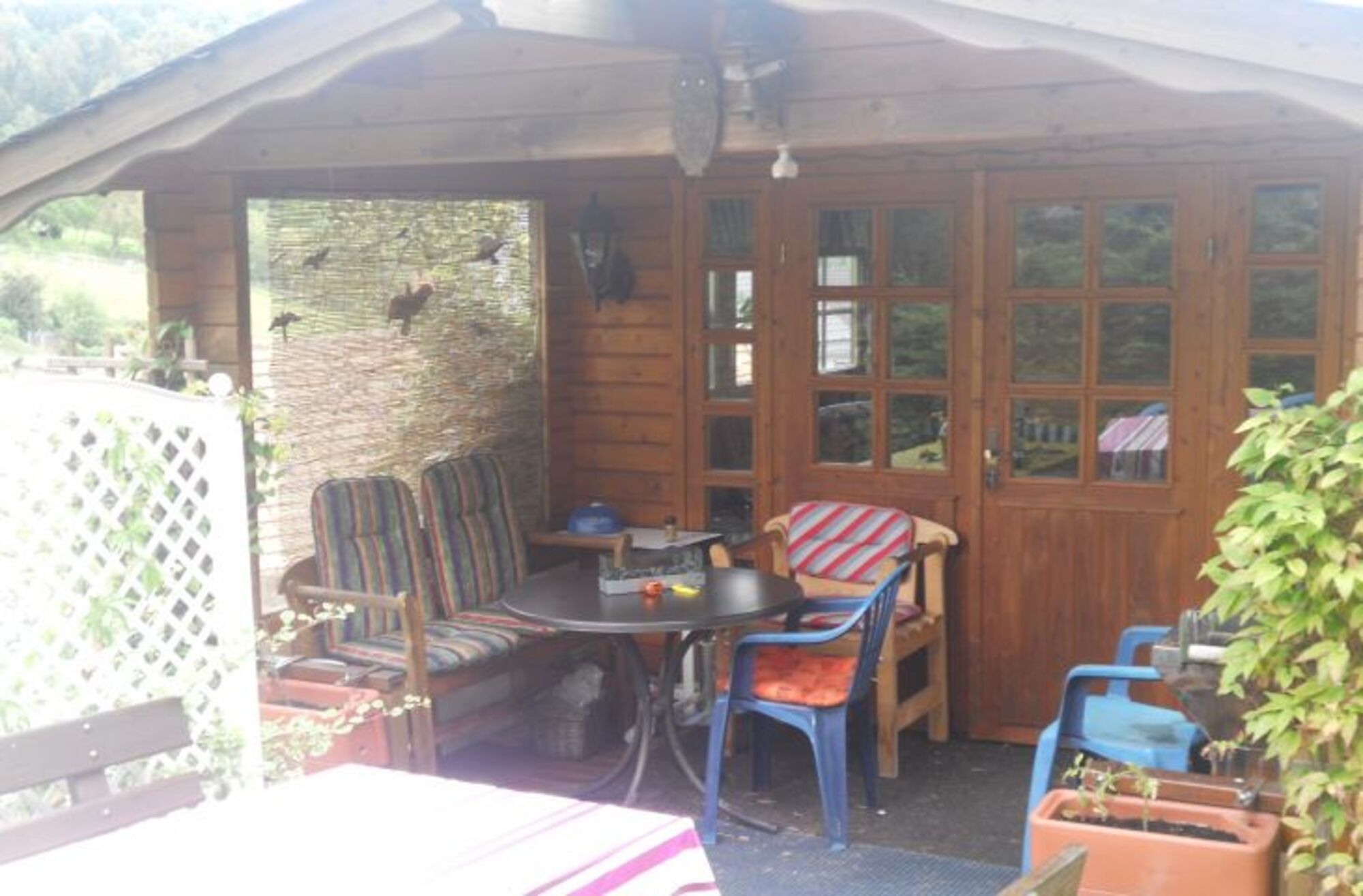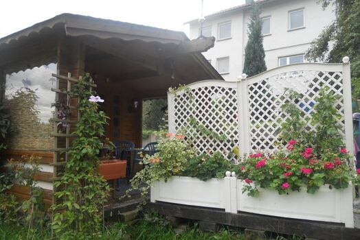 und Grill und ein eingerichtetes kleines Gartenhaus zur