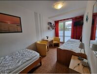 Schreibtisch, Ausgang zur Terrasse, 2 Sessel Einzelbett, Spiegel, Leselampe am Bett, Fliegengitter