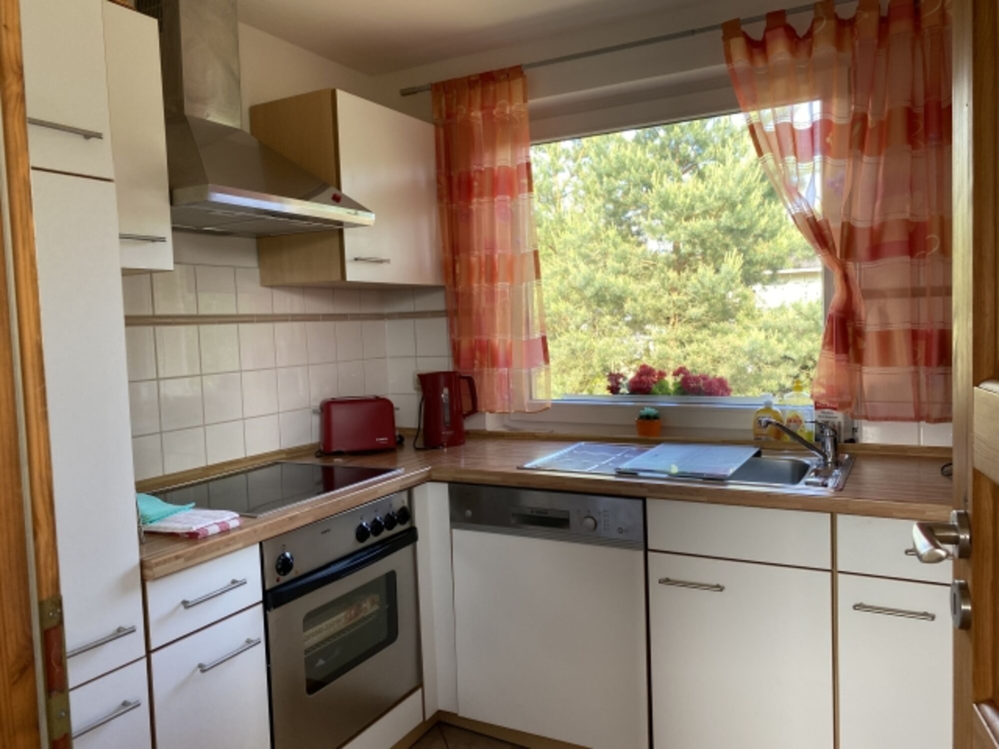 4-Platten Herd, Cerankochfeld, Dunstabzugshaube, Kühlschrank mit Gefrierfach, Eierkocher, Gewürze (Salz, Pfeffer, Zucker), Geschirrhandtücher, Mülltüten